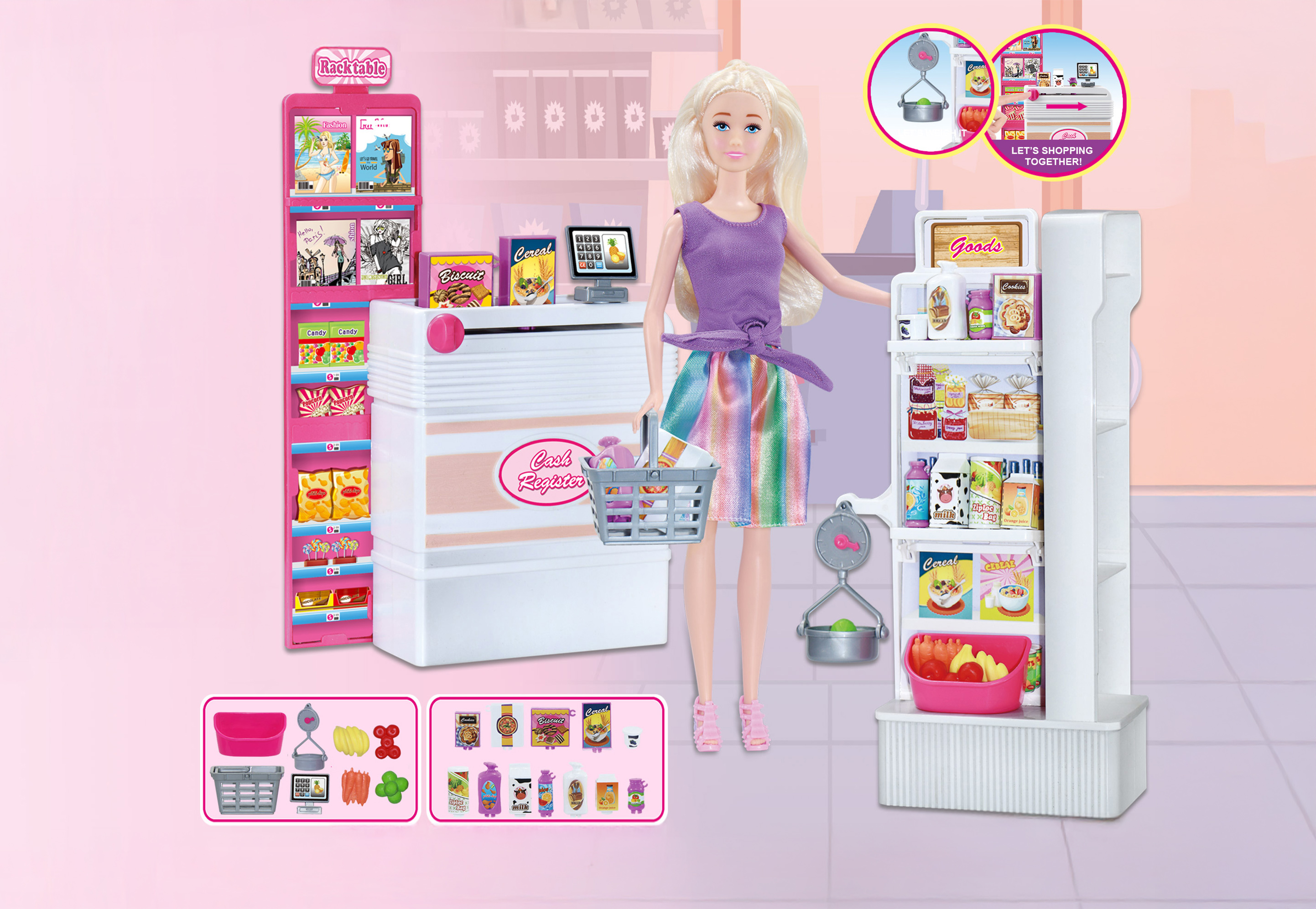 Panenka prodavačka. Velikost 30 cm. Obsahuje panenku, regál na zboží, potraviny a zboží, pokladnu s pásem, nákupní košík a další doplňky.
