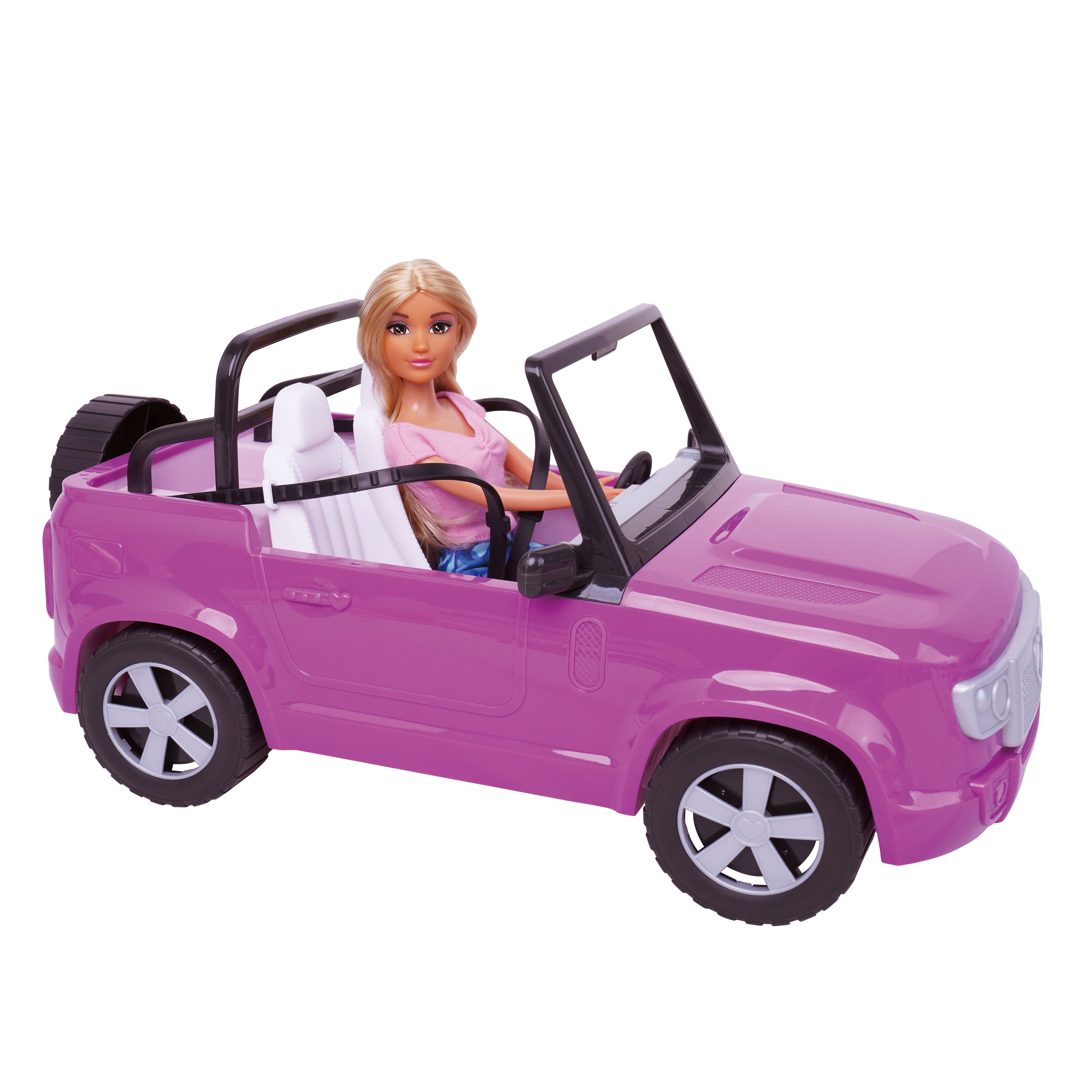 Panenka s autem. Velikost panenky 30 cm. Součástí auto, selfie tyč a sluchátka.