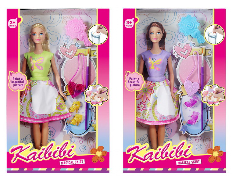 Panenka s vodním malováním. Velikost 30 cm. Vodní malování na sukni. Součástí štětec, kabelka, střevíce. Jen zelené šaty.