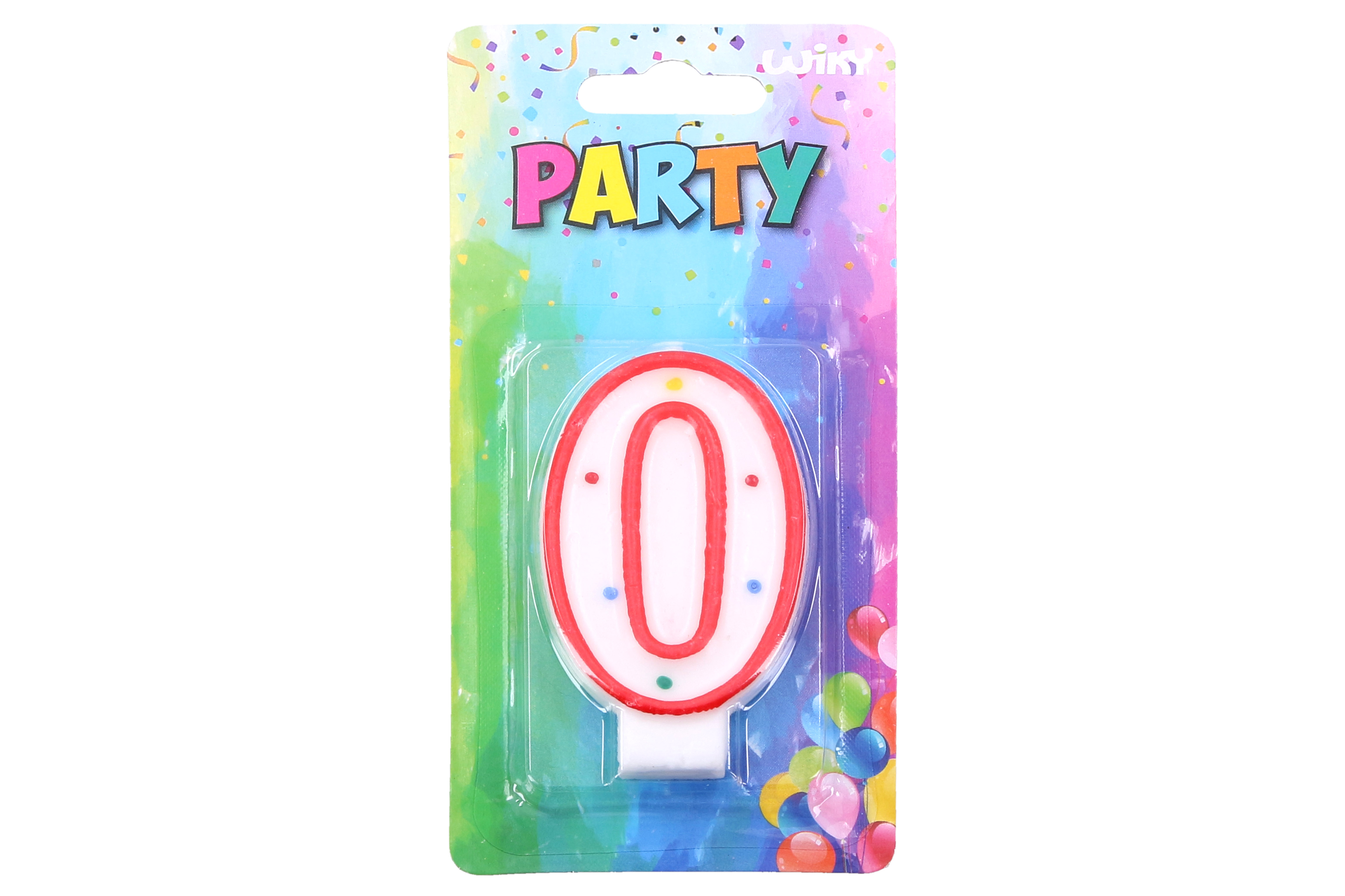 Party svíčka - číslo 0 - bílá s červenými okraji a barevnými puntíky
