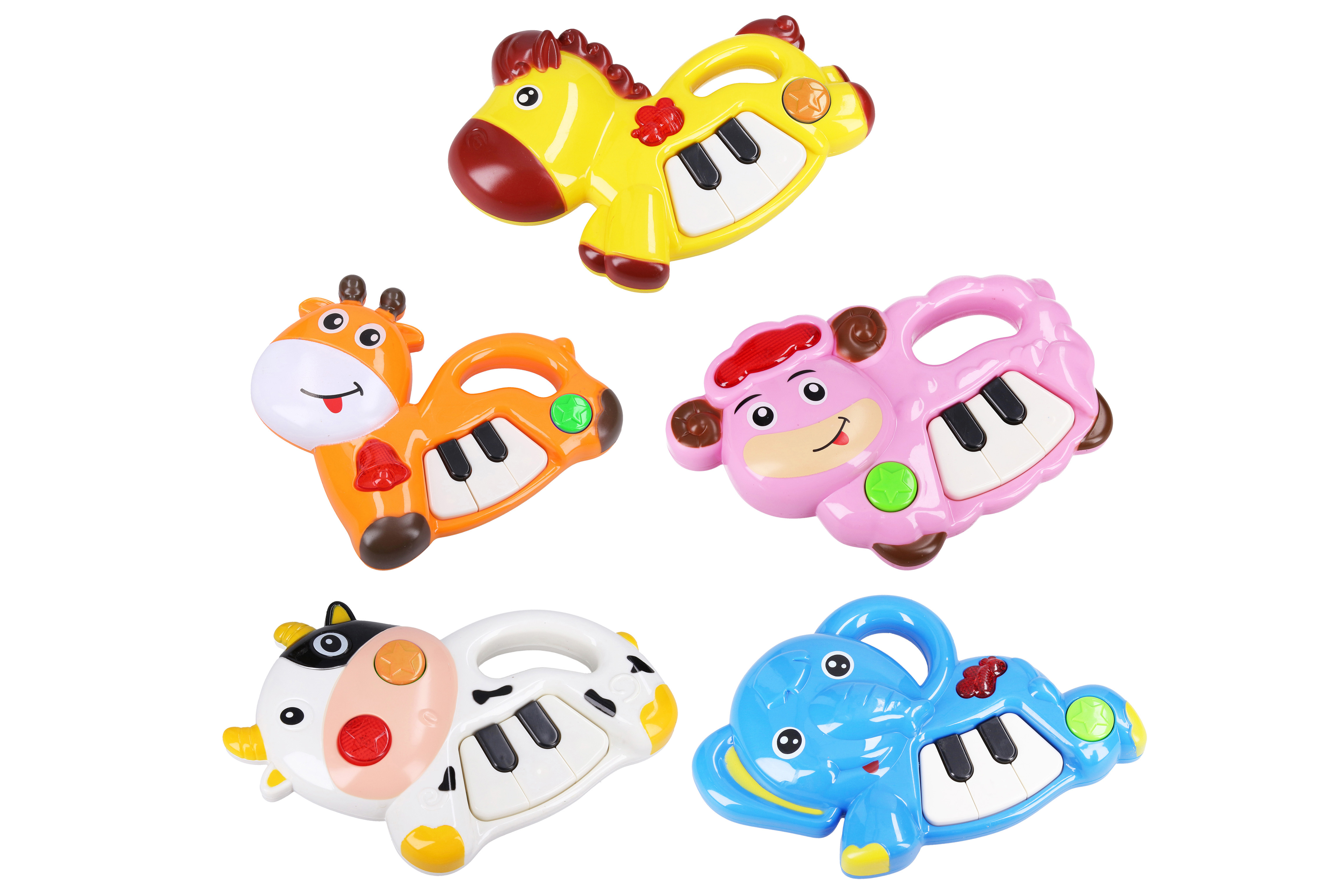 Piano zvířátko. Velikost 18 cm. 2xAA baterie nejsou součástí. 5 variant - kravička, ovečka, žirafa, kůň, slon.