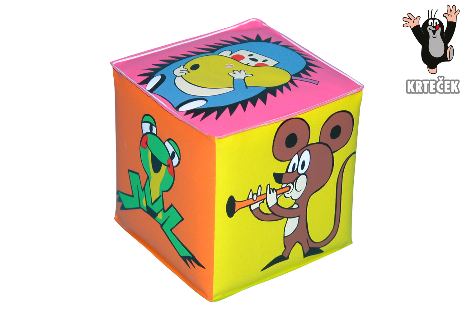 Pískací kostka z bezpečného materiálu pro miminka z kolekce s oblíbenými postavičkami Krtečka a jeho kamarádů přinese dětem velkou zábavu. Každá stěna kostky je jinak barevná a je na ní zobrazen buď Krteček nebo jeho kamarádi. Kostka vydává pískací zvuk.