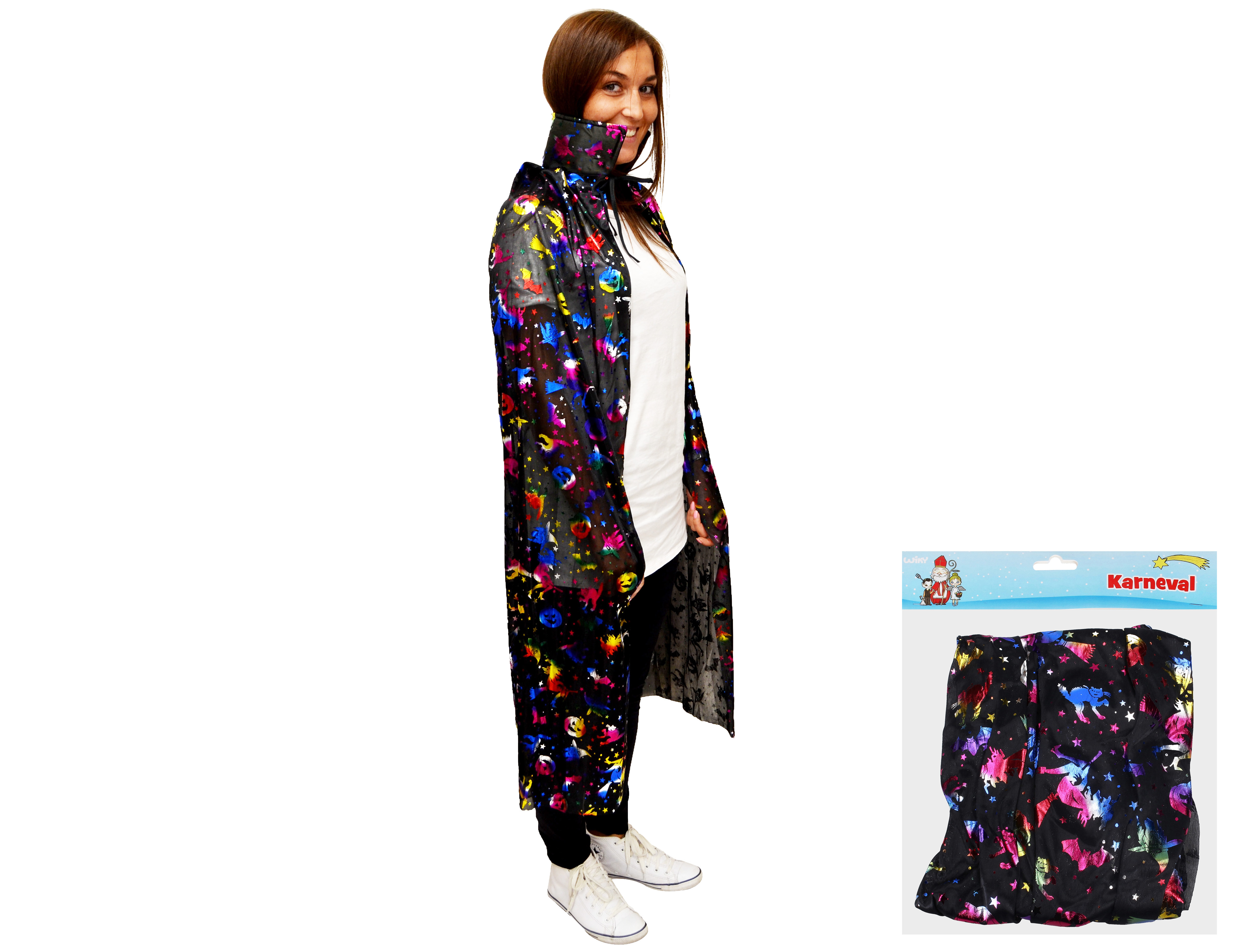 Plášť ideální pro malou čarodějku nebo čaroděje. Je vyroben z lesklého materiálu s potiskem barevných dýní. Plášť má límec a vázání na šňůrku u krku. Délka pláště: 120cm
