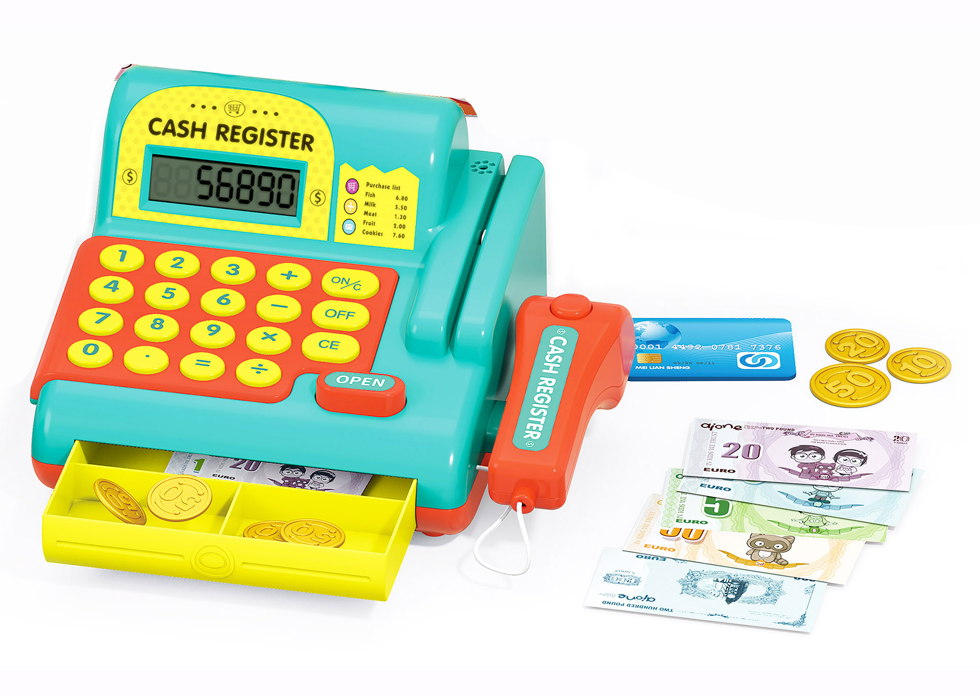 Pokladna s efekty. Velikost 20x16x11cm. Baterie 2xAA není součástí.