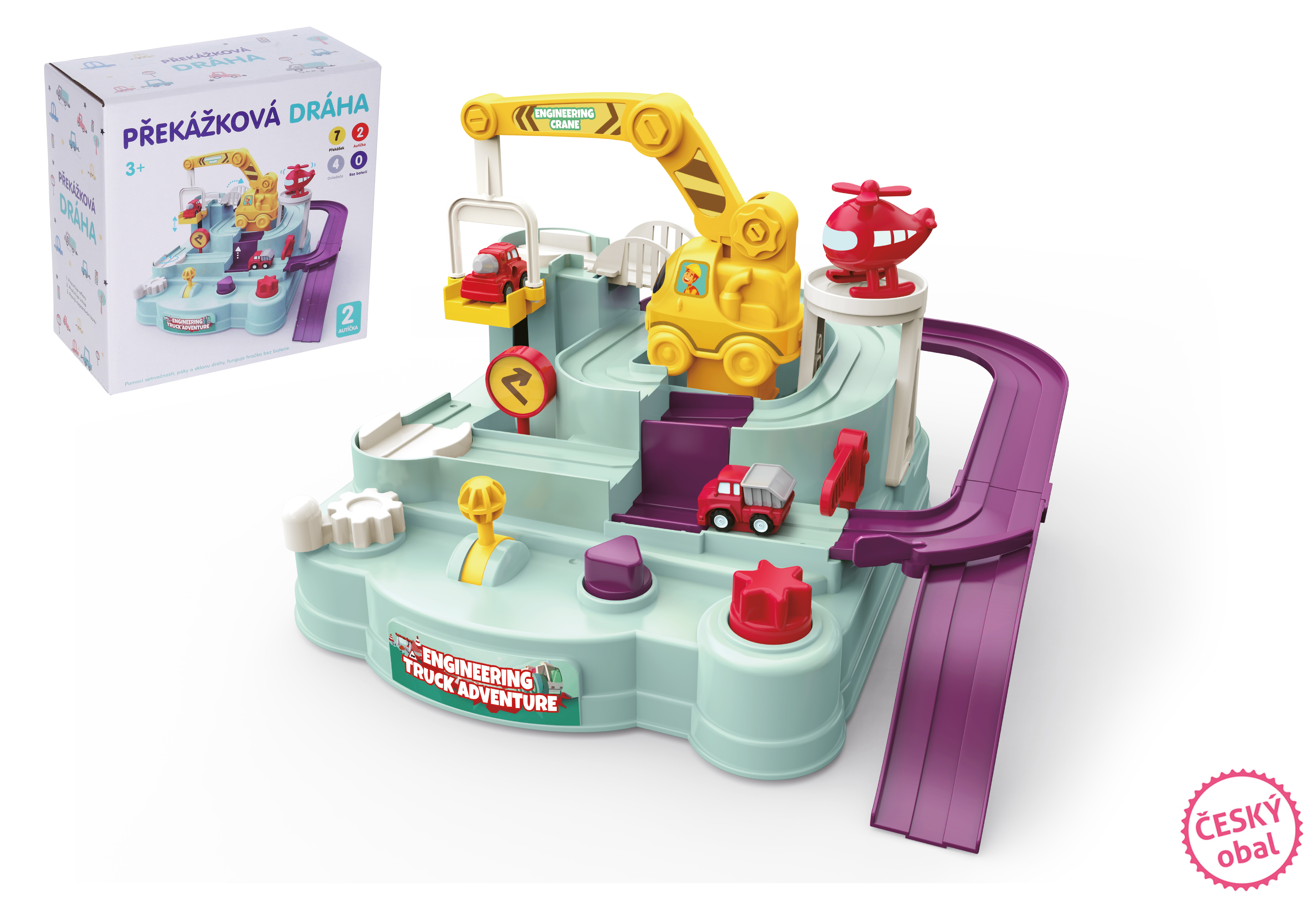 Obsah balení: 4 ovládací prvky (kolečka, páčky). 2 auta. Doporučený věk: 3+
