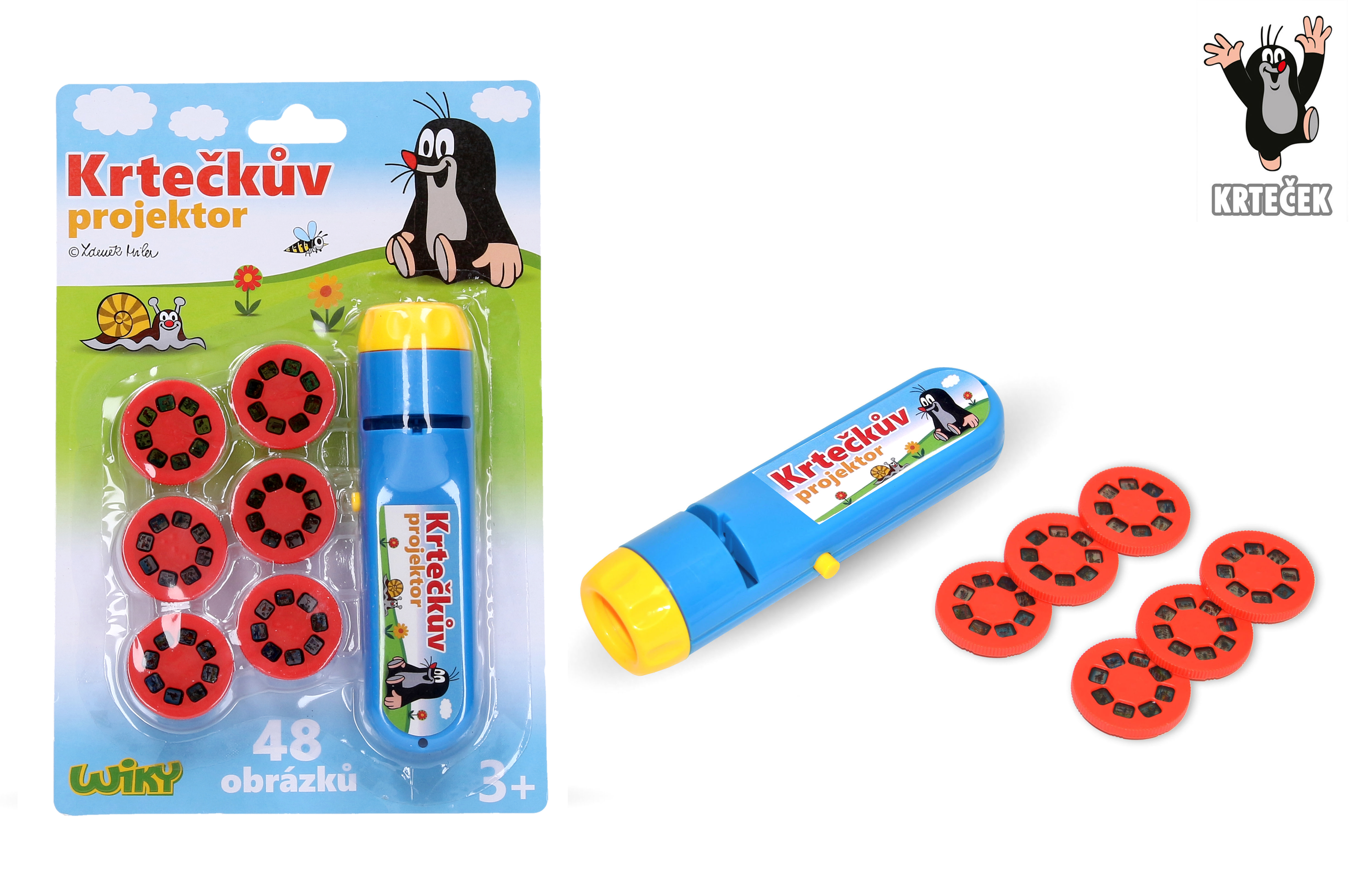 Projektor krtek. Velikost 13,5 cm. Obsahuje 48 obrázků. 2xAA baterie, nejsou součástí balení, na spodní straně.