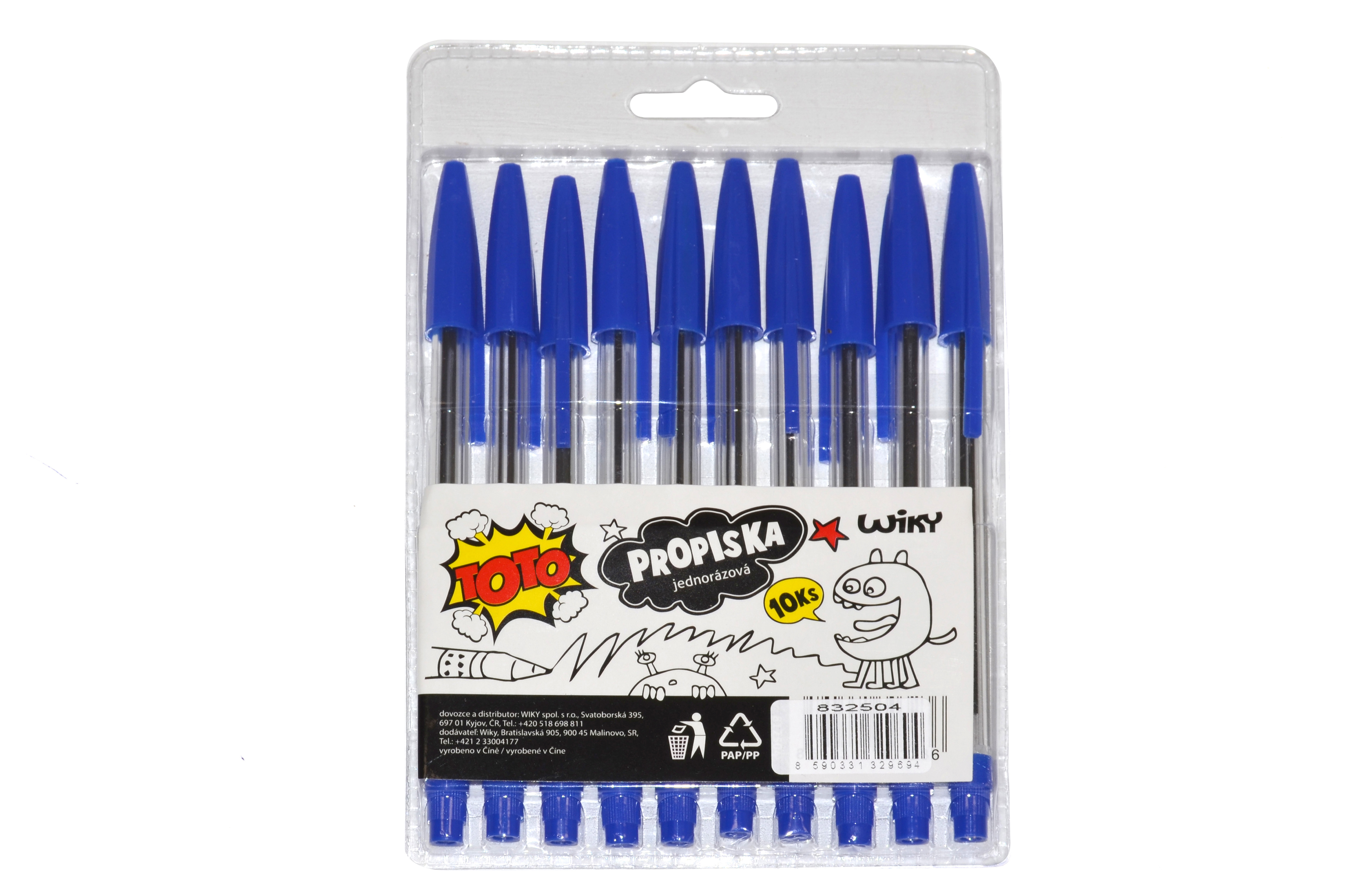 Sada modrých jednorázových propisek značky TOTO pro psaní ve škole nebo volném čase.  V balení je 10 kusů