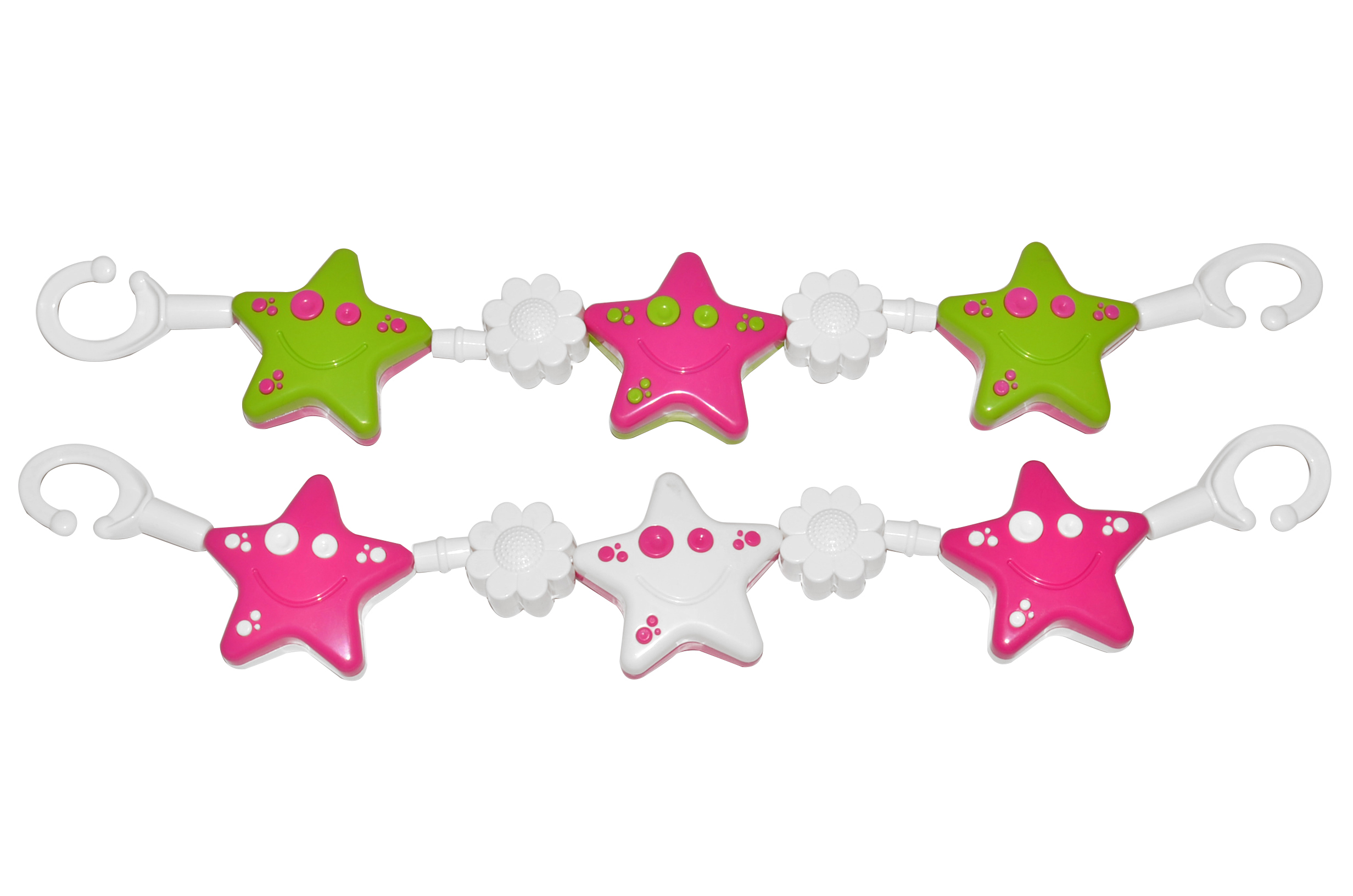 Řetěz na kočárek - hvězdy, kytičky. Figurky z tvrdého plastu navlečené na mírně pružicím lanku jsou barevné a jednoduše tvarované (stačí umýt v mýdlové vodě). Snadno se připevní na kočárek. Jsou vyrobeny ze zdravotně nezávadných materiálů podléhajícím přísným hygienickým normám.