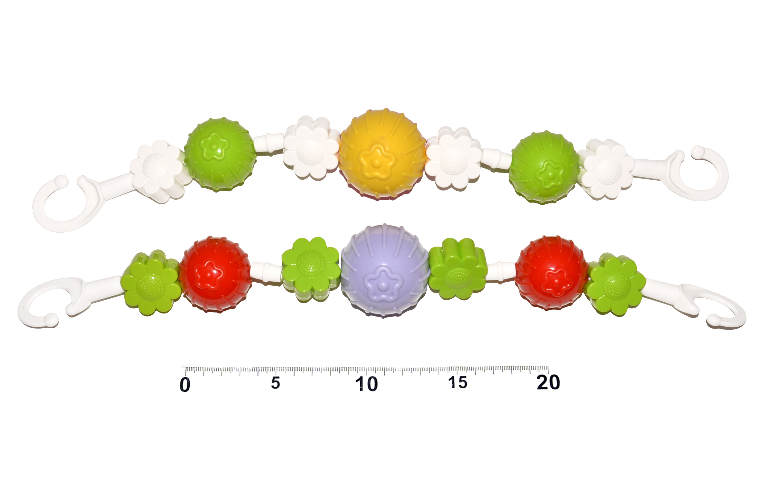 Řetěz na kočárek - kytičky, koule. Figurky z tvrdého plastu navlečené na mírně pružicím lanku jsou barevné a jednoduše tvarované (stačí umýt v mýdlové vodě). Snadno se připevní na kočárek. Jsou vyrobeny ze zdravotně nezávadných materiálů podléhajícím přísným hygienickým normám. Barevné varianty - bílá, mentolová, modrá, růžová.