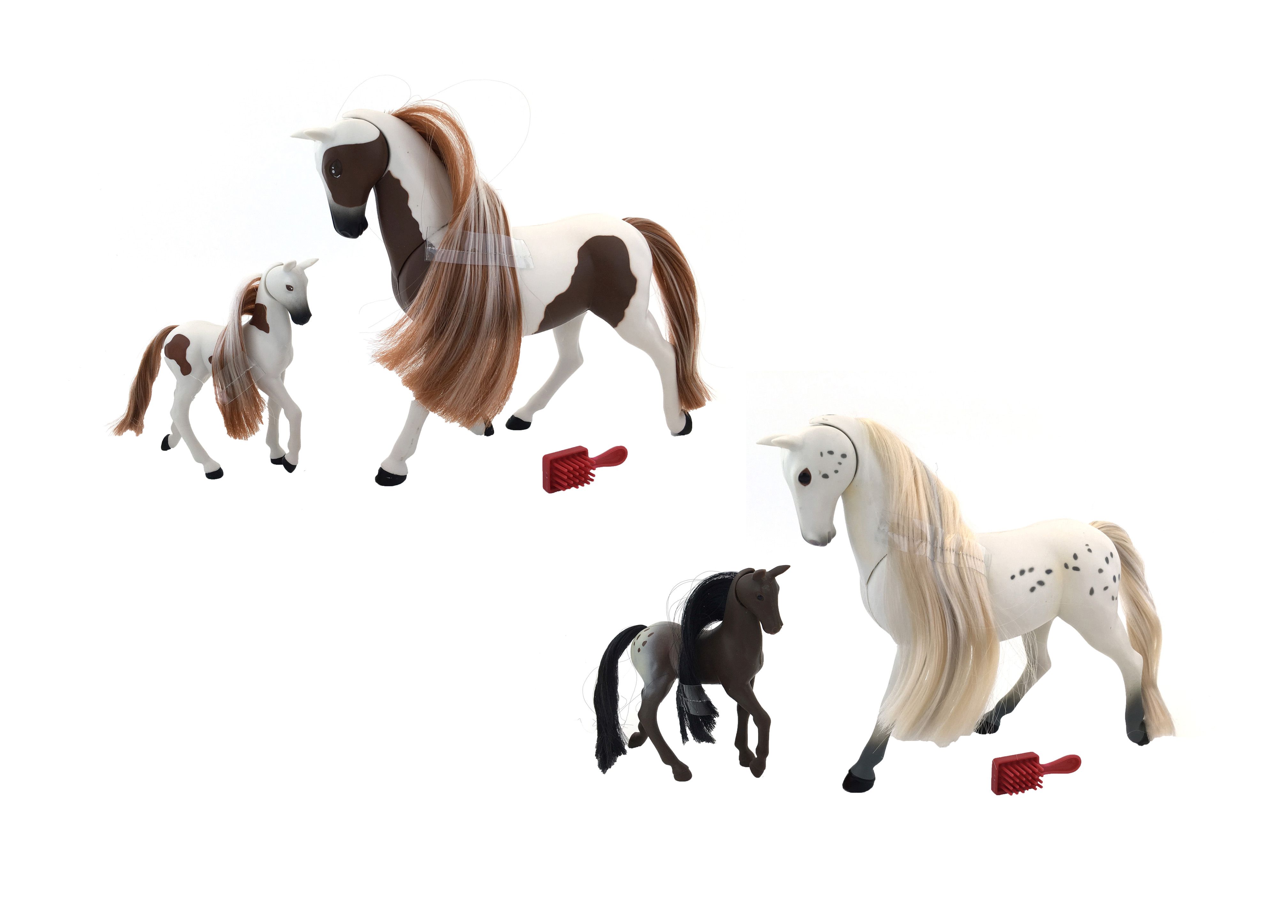 Hříbátko má svoji maminku velmi rádo. Vždy když se k němu nakloní dá jí pusinku. Součástí balení je jablko, mrkev a kartáč na rozčesání jejich krásné hřívy. Velikost koní: 18 a 11 cm