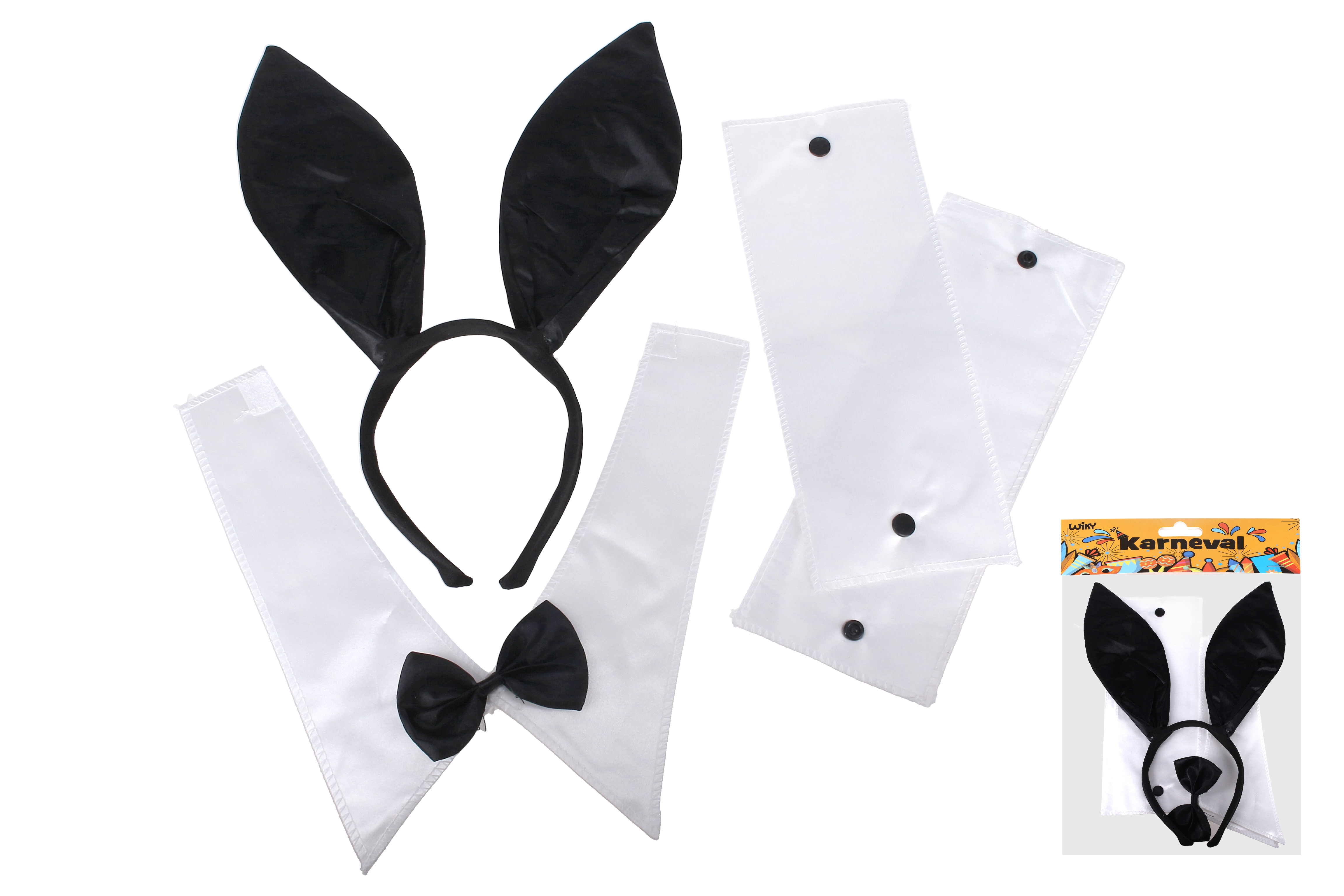 Set karneval zajíc. Obsahuje čelenka uši, motýlek na krk s límcem, manžety na ruce.