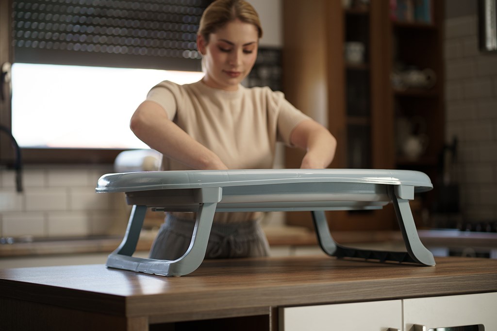 Vanička je vybavena výpustním ventilem a páskovým teploměrem, což výrazně zvyšuje komfort a bezpečnost při každodenním používání. Dá jednoduše složit na výšku pouhých 10 cm, přičemž plastové nožičky se sklopí přímo pod vaničku – díky čemuž zabírá minimum místa a je ideální pro skladování i v menších prostorách.