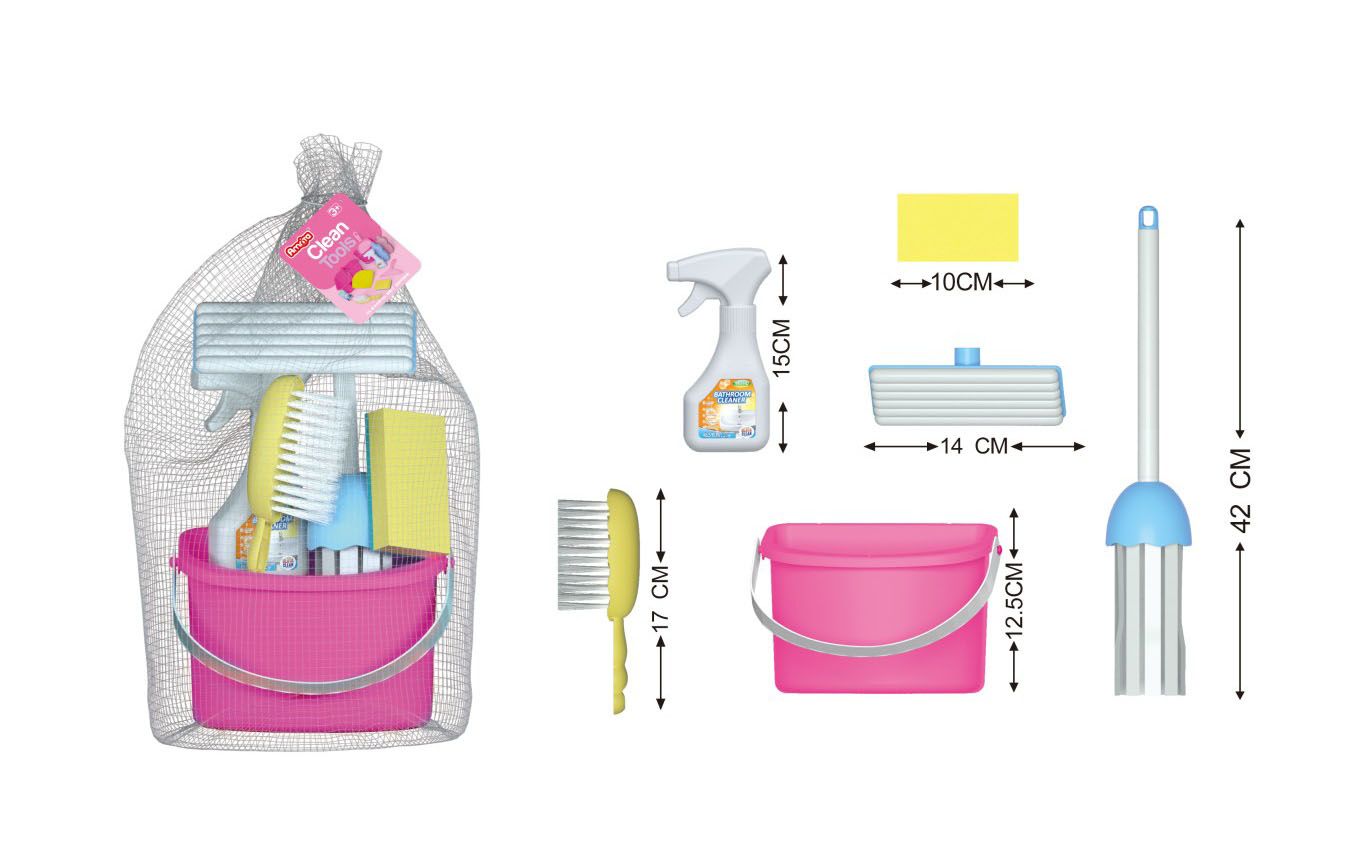 Úklidový set. Součástí kbelík, mop, smetáček, houba, čistící prostředek.