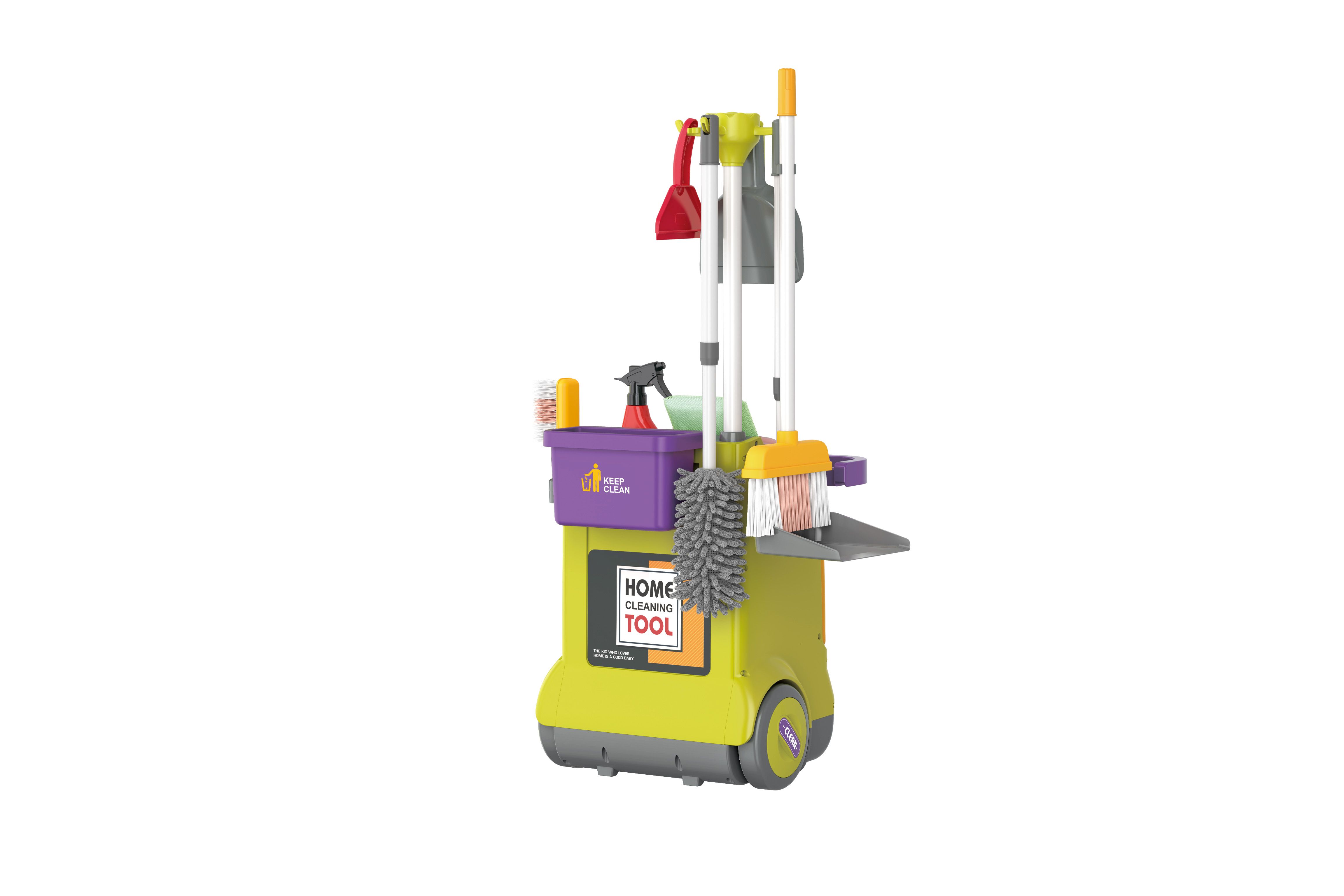Úklidový set s vozíkem. Rozměry 33,5x31,5x71 cm. Vozík, lopatka velká, lopatka malá, smeták velký, smeták malý, smetáček, prachovka, stěrka na okna, mýdlo, 2 čistící prostředky ve spreji, podložka, pouzdro. varovná cedule. Obrázkový návod na složení na obalu.