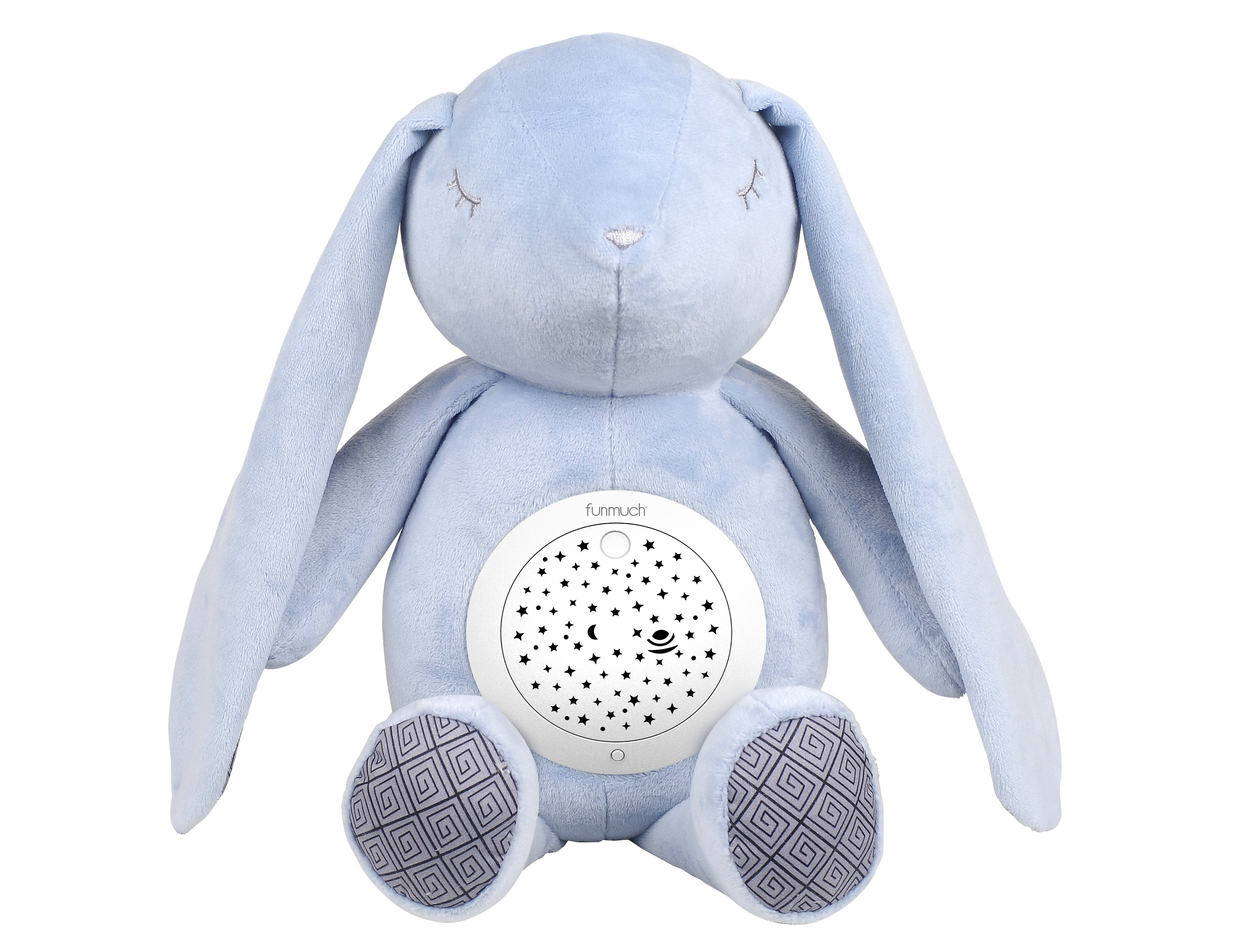 Usínací zajíc s projekcí. Velikost 26 cm. Baterie 3xAAA nejsou součástí. Projektor na bříšku zajíce svítí, hraje a otáčí se. Otočením projektoru proti směru hodinových ručiček se spustí ukolébavka. Projektor jde vyjmout z bříška zajíce. Dozadu projektoru se vkládají baterie. Projekce se zapíná tlačítkem.