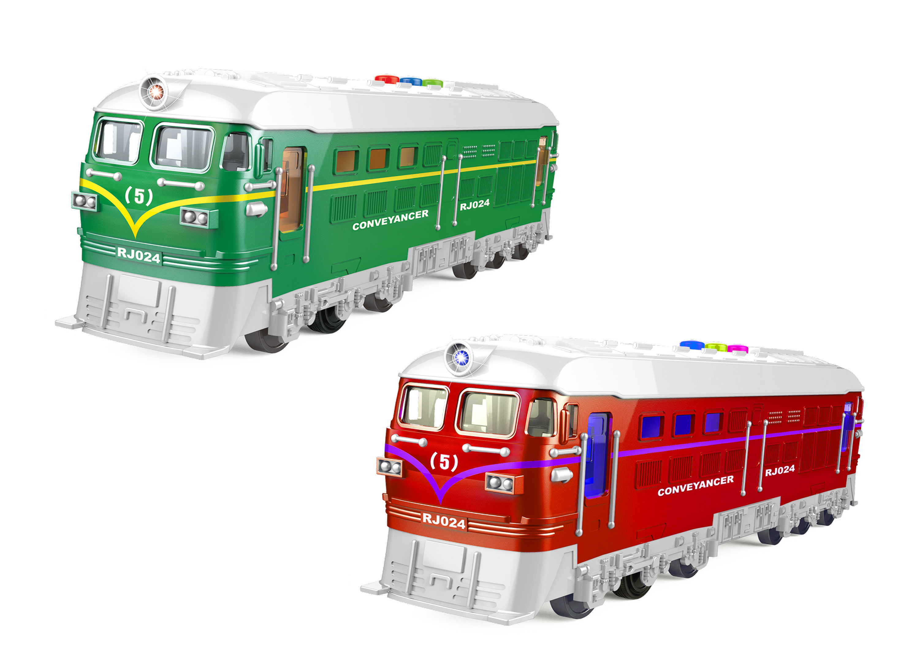 Vlak na setrvačník. Velikost 23,5 cm. Vydává světelné a zvukové efekty (aktivace tlačítky na střeše). Přesné rozměry 23,5x4x7 cm. Baterie 3xAG13, jsou součástí balení. 2 varianty - červená, zelená.