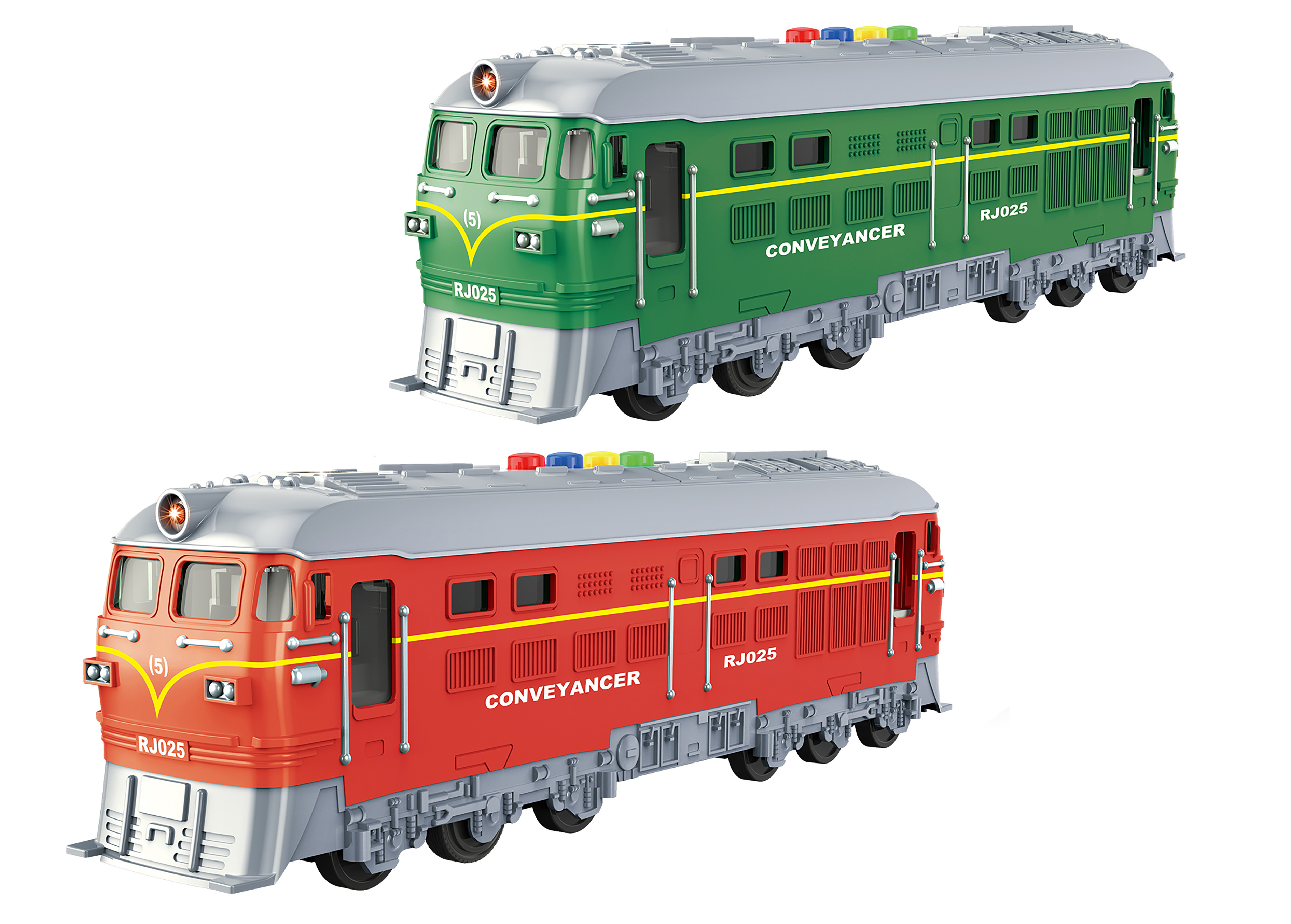 Vlak na setrvačník s efekty. Rozměry 34x6,5x10 cm. Vydává světelné a zvukové efekty. Aktivace tlačítky na střeše. 3xAAA baterie nejsou součástí. 2 varianty - zelená, červená.