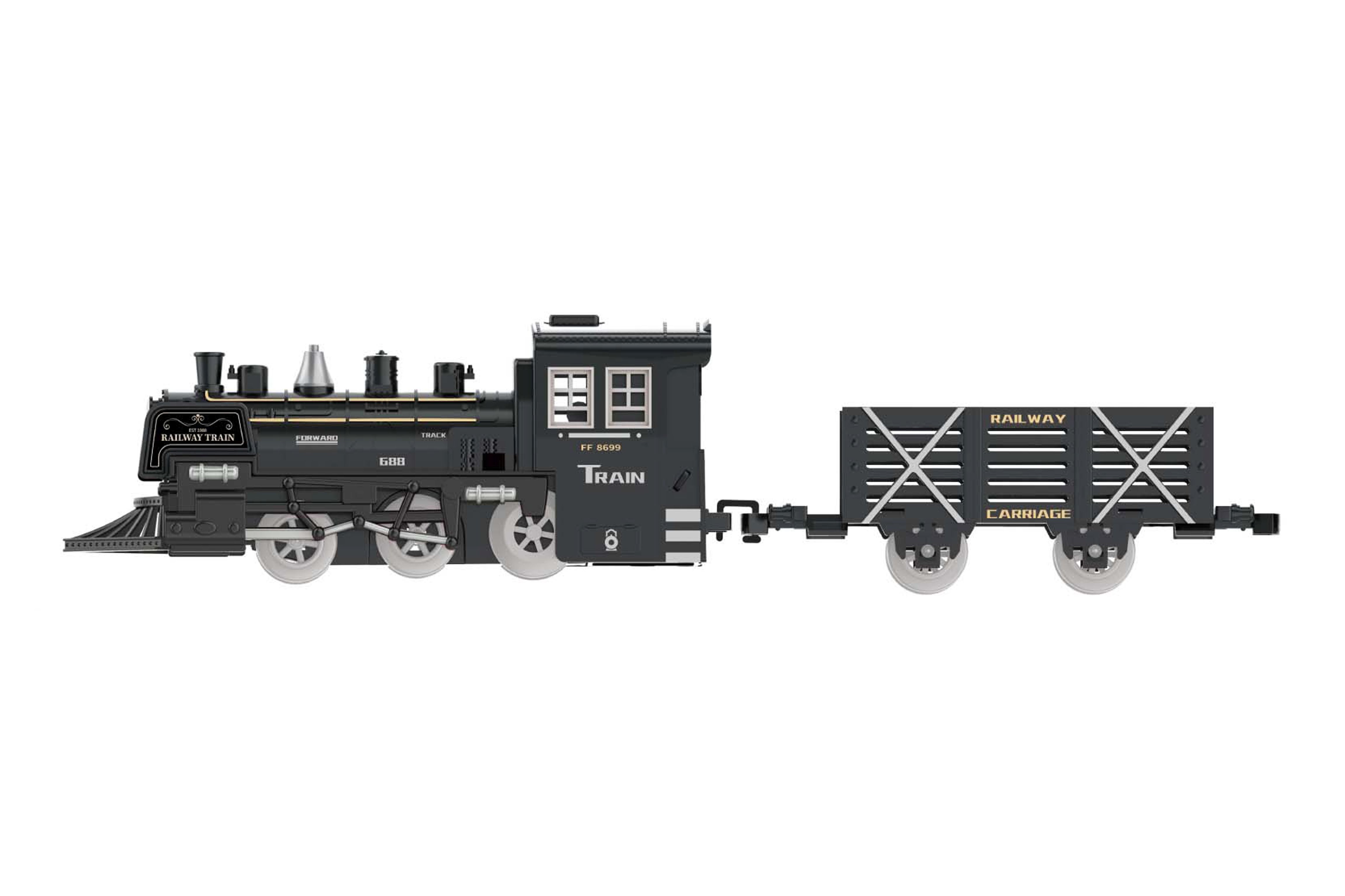 Vlak set. Rozměry železnice 75x75 cm, velikost mašinky 19,5 cm, vagónu 15,5 cm. Světelné, zvukové a kouřové efekty. 4xAA baterie do mašinky nejsou součástí. Přepínač ON/OFF na levé straně mašinky. Součástí mašinka, 1 vagón, 6 zahnutých kolejnic, nádobka na vodu. Nádržka na vodu pod stříbrným komínkem.
