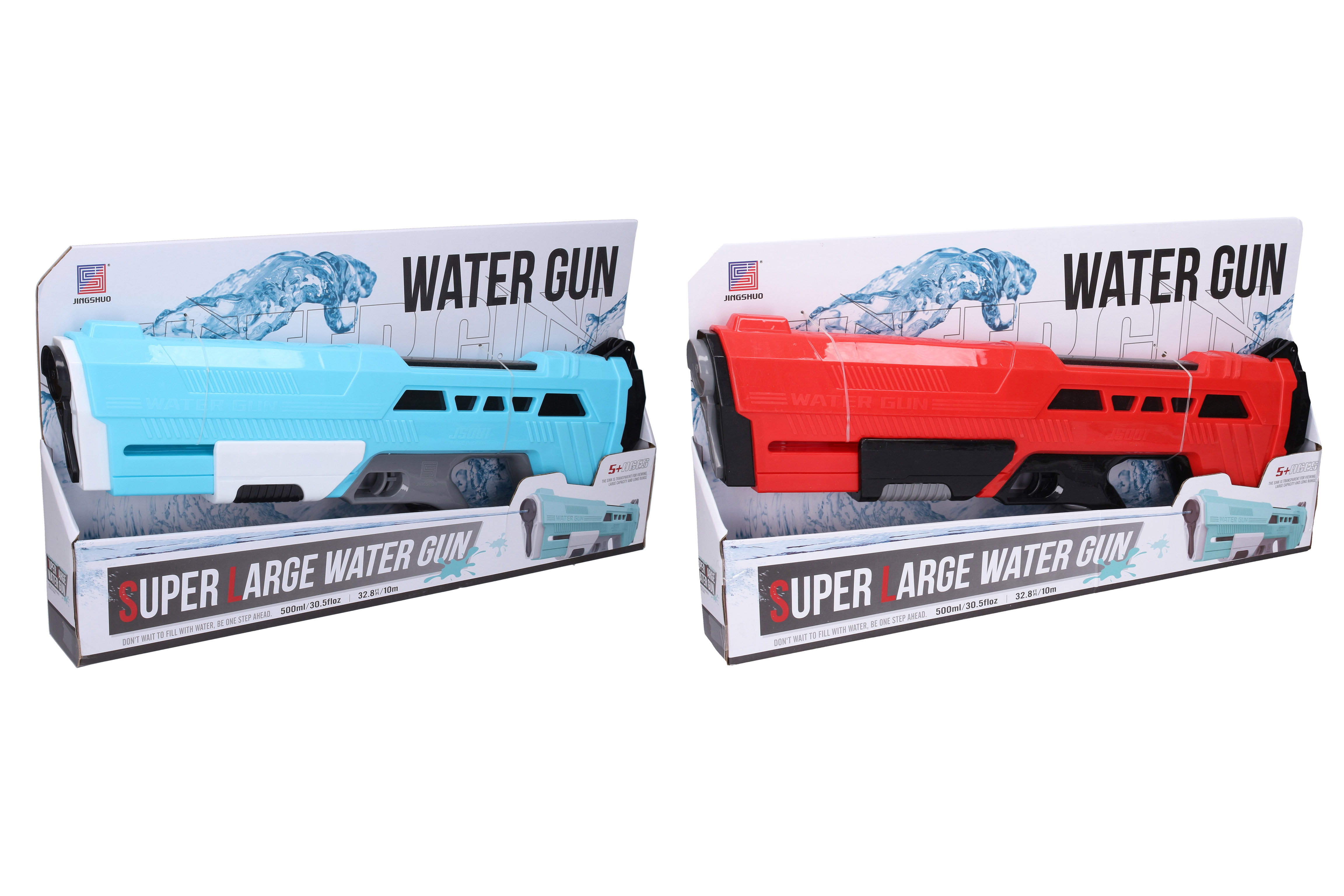 Vodní puška. Délka 52 cm. Střelba pumpováním. 2 varianty - modrá, červená.