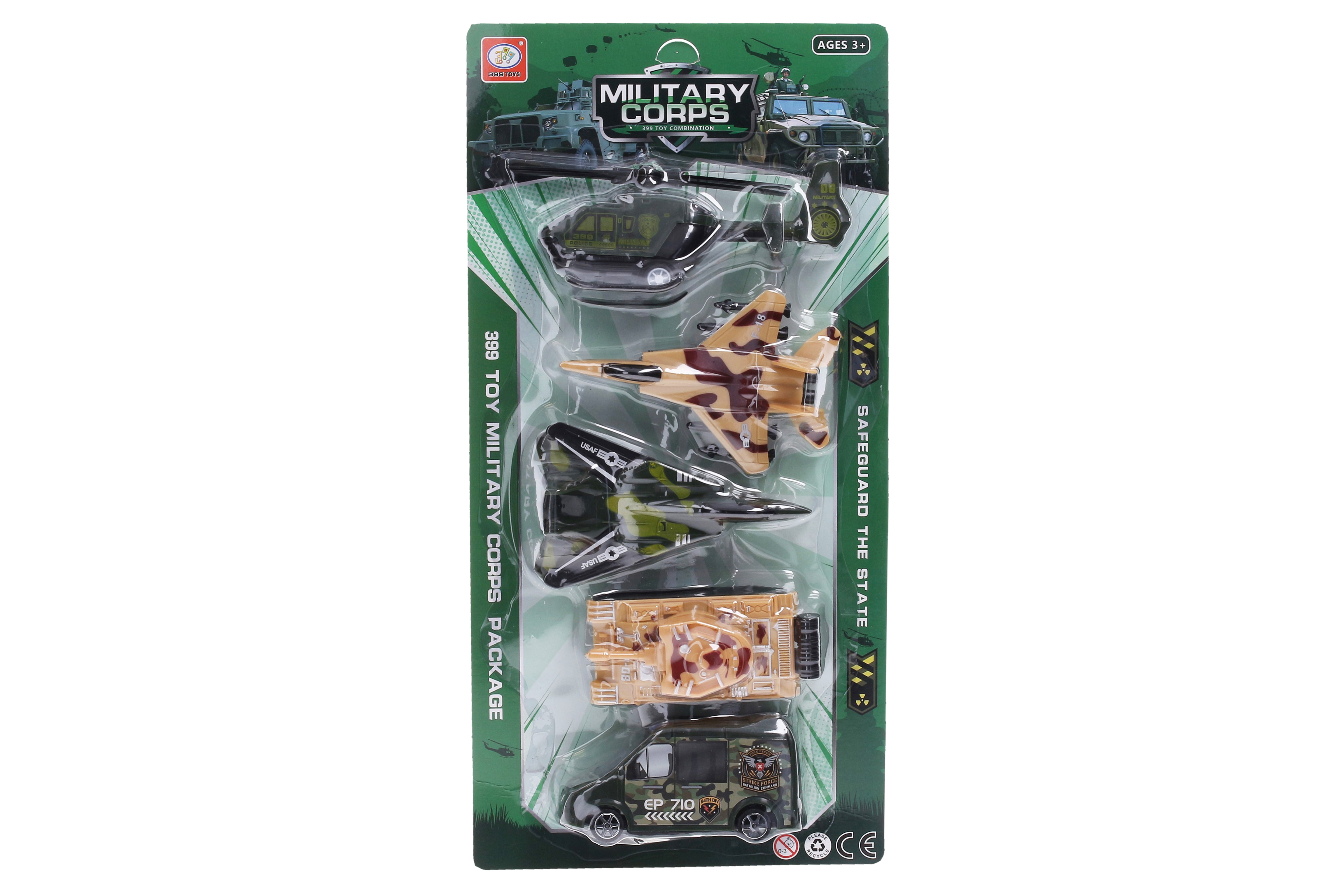 Vojenský set. Na zpětné natažení a volná kola. Velikost vrtulníku 16,5 cm. Součástí vrtulník, 2 stíhačky, tank, auto.