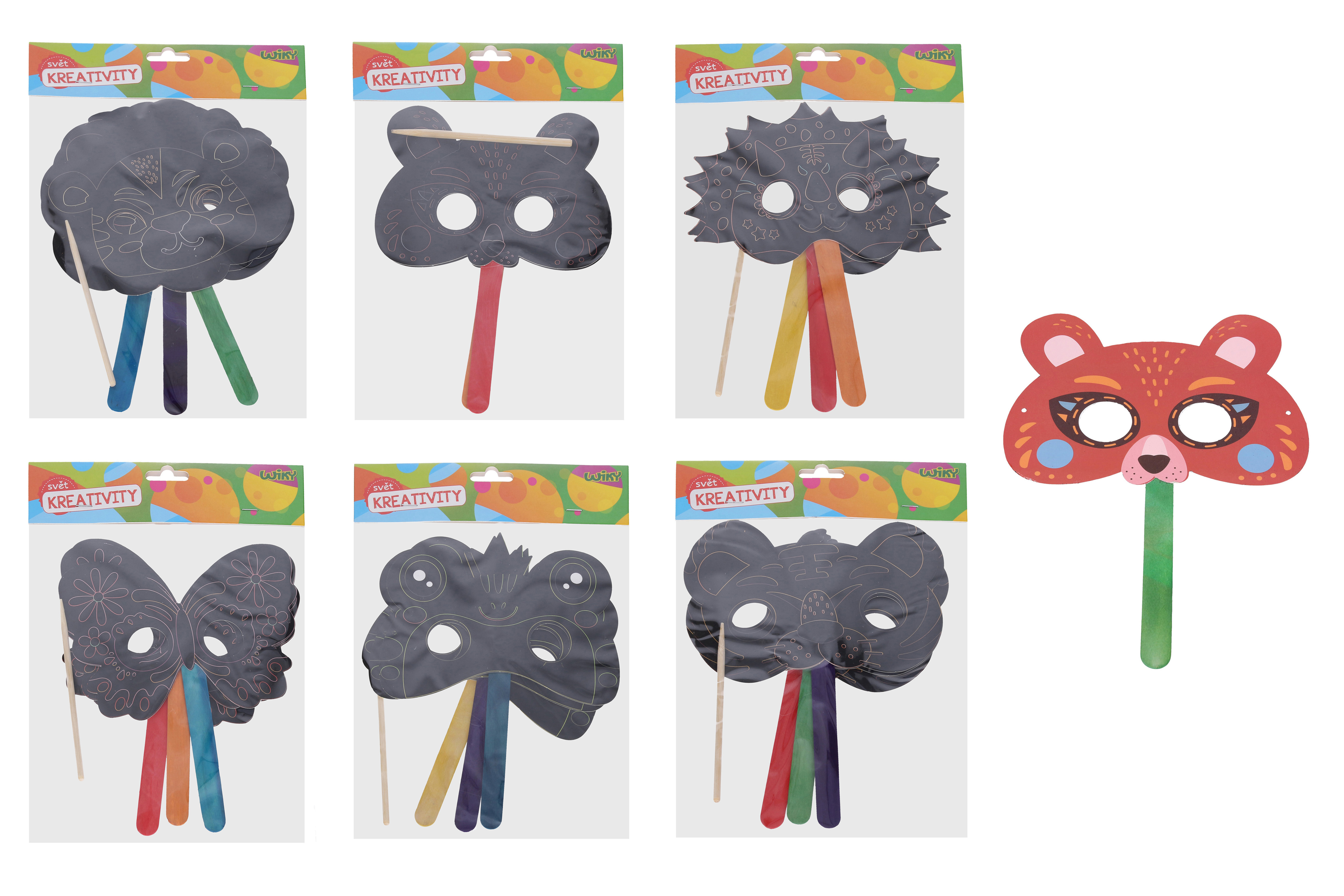 Kreativní set - vyškrabovací maska + vyškrabovátko - 3ks v balení. 6 variant zvířátek: lev, dinosaurus, motýl, žaba, tygr, medvěd.