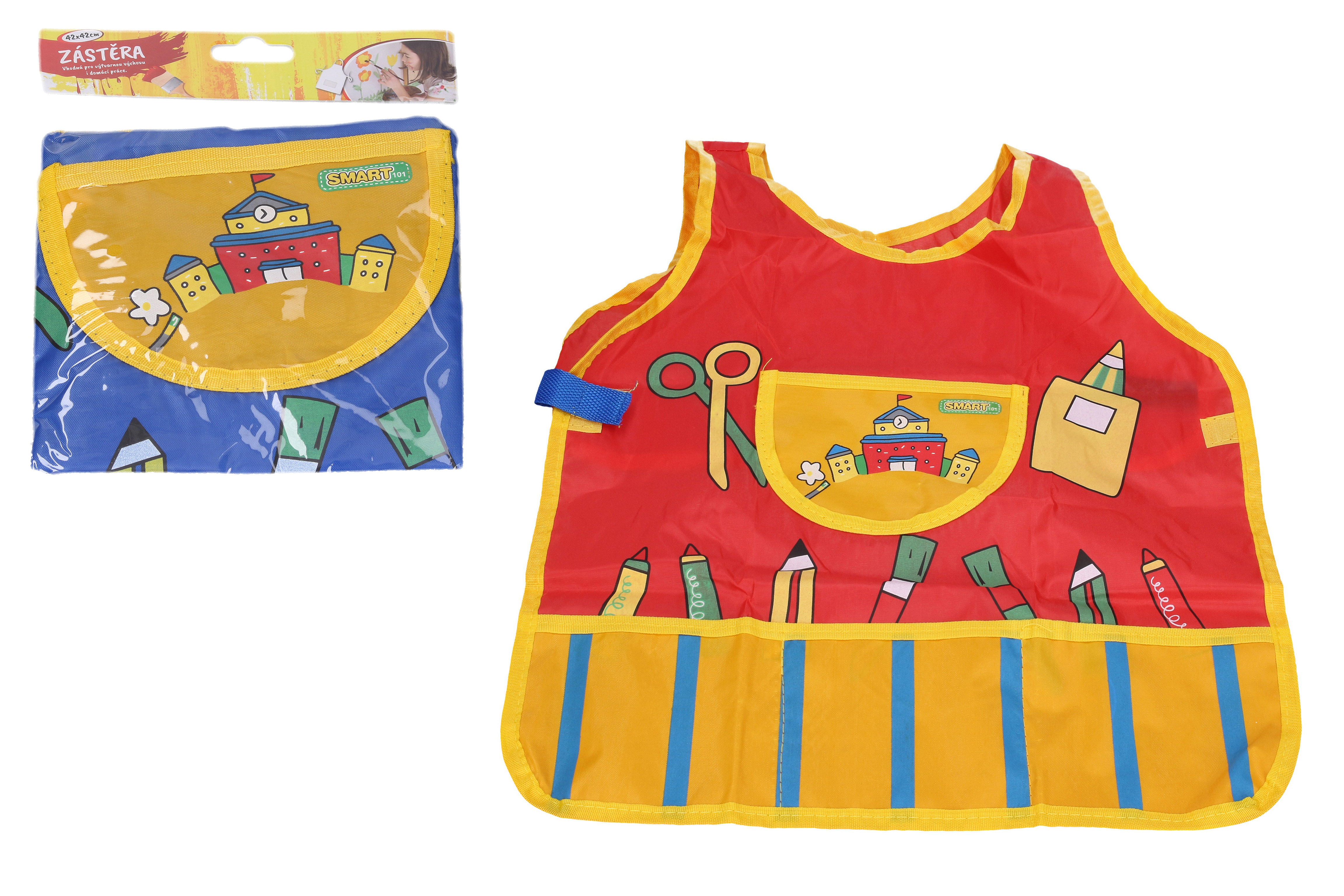 Zástěra na výtvarnou východu o velikosti 42x42 cm.