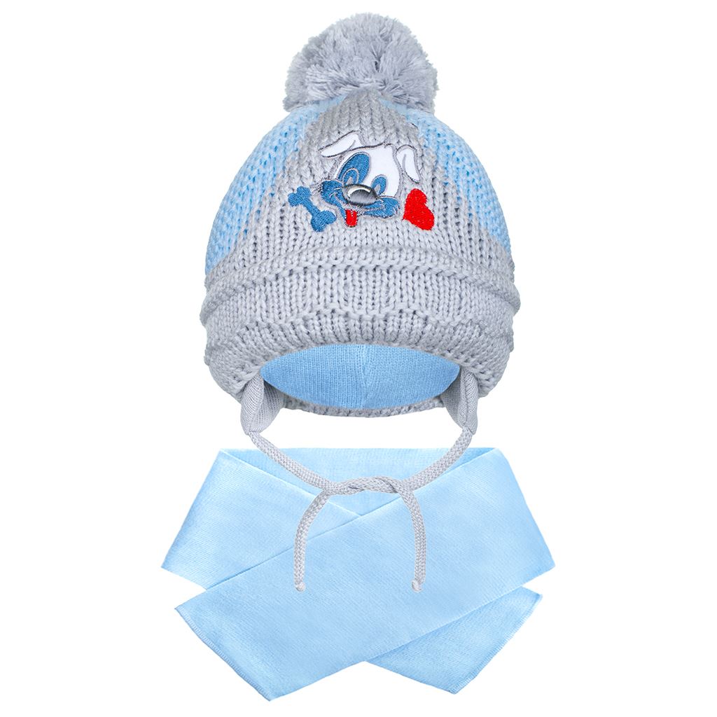 Nádherná zimní pletená čepička New Baby. Čepičku zdobí nádherný obrázek pejska. Má zavazovací tkaničky, úpletovou podšívku a roztomilou bambulku. Složení 100% bavlna. Čepička je vhodná pro zimní dny. Ideálni pro malé i větší děti. Čepička je tvarovaná tak, aby kryla ouška. Obvod kolem hlavičky 44-48 cm. Šála: rozměr: cca 96 cm.