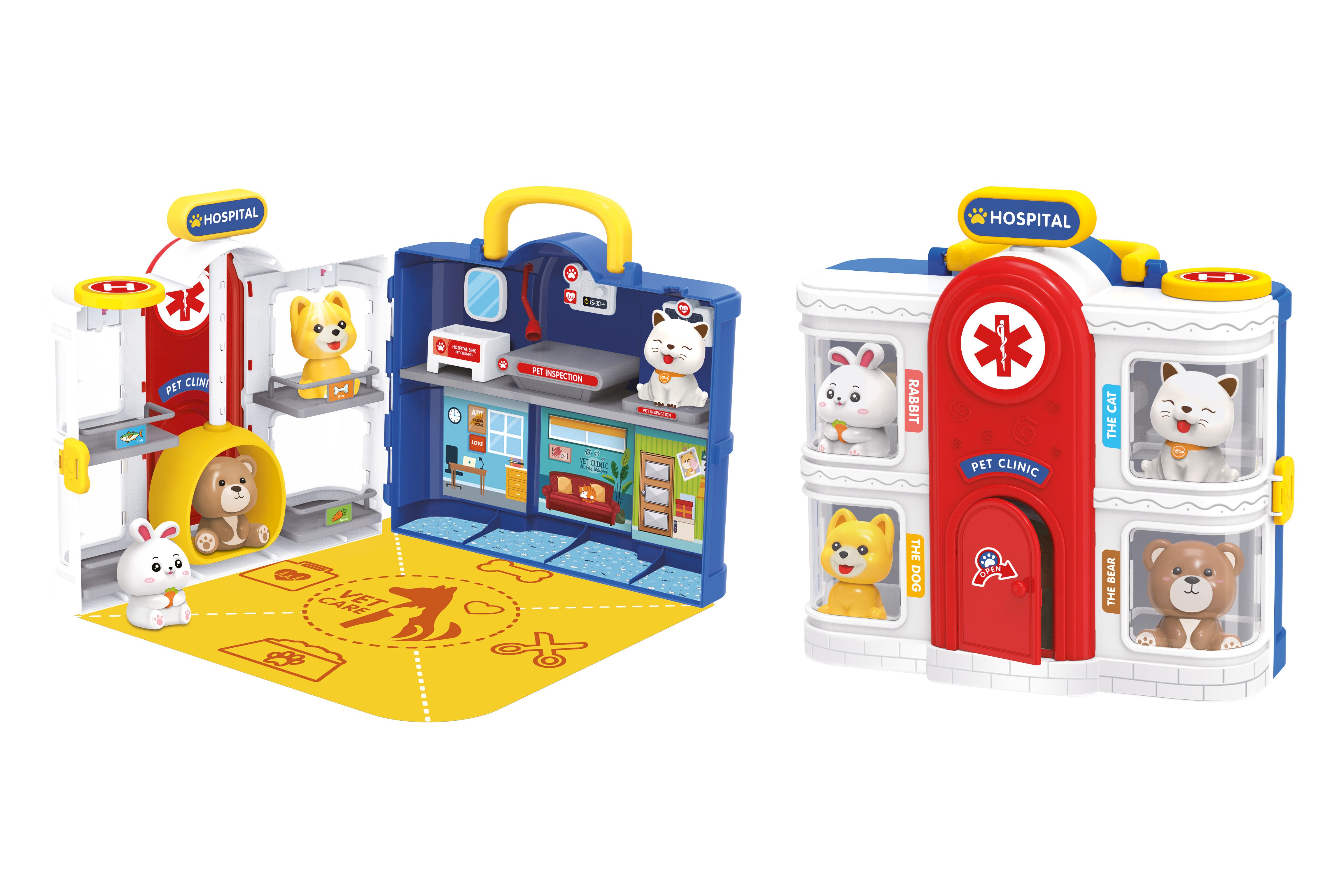 Zvířecí nemocnice přenosná s efekty. Rozměry kufříku 28x14x28 cm. Světelné efekty - stetoskop, bezkontaktní teploměr, oba vnitřní balkóny (přepínače ON/OFF). Obsah - rozkládací nemocnice s manuálním výtahem, 4 zvířátka - pejsek, kočička, medvídek, králíček, nástroje - stetoskop, teploměr, injekce, nůžky, kleště, pilulky. Používejte dle obrázků na obalu. 2xAG10 baterie do osvětlení každého balkónu, 2xAG10 do stetoskopu, 2xAG10 do teploměru součástí.