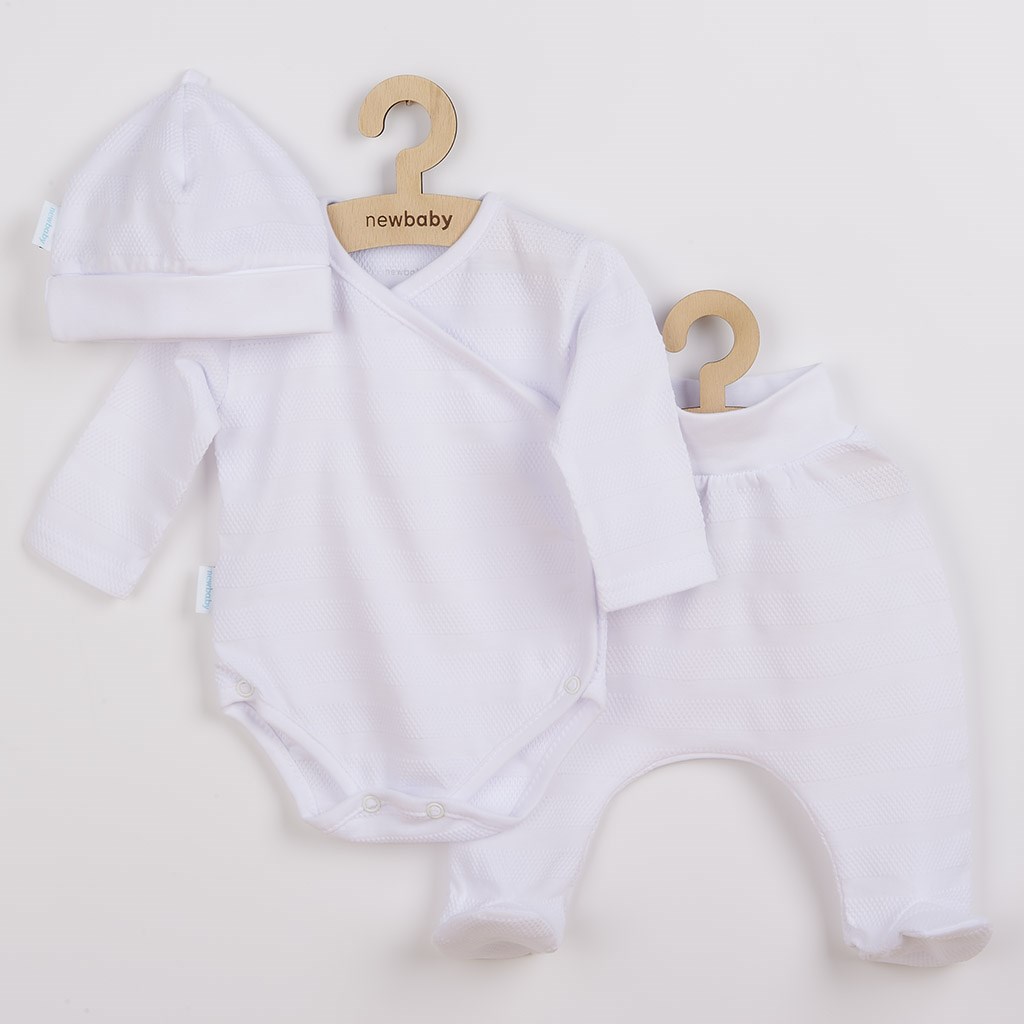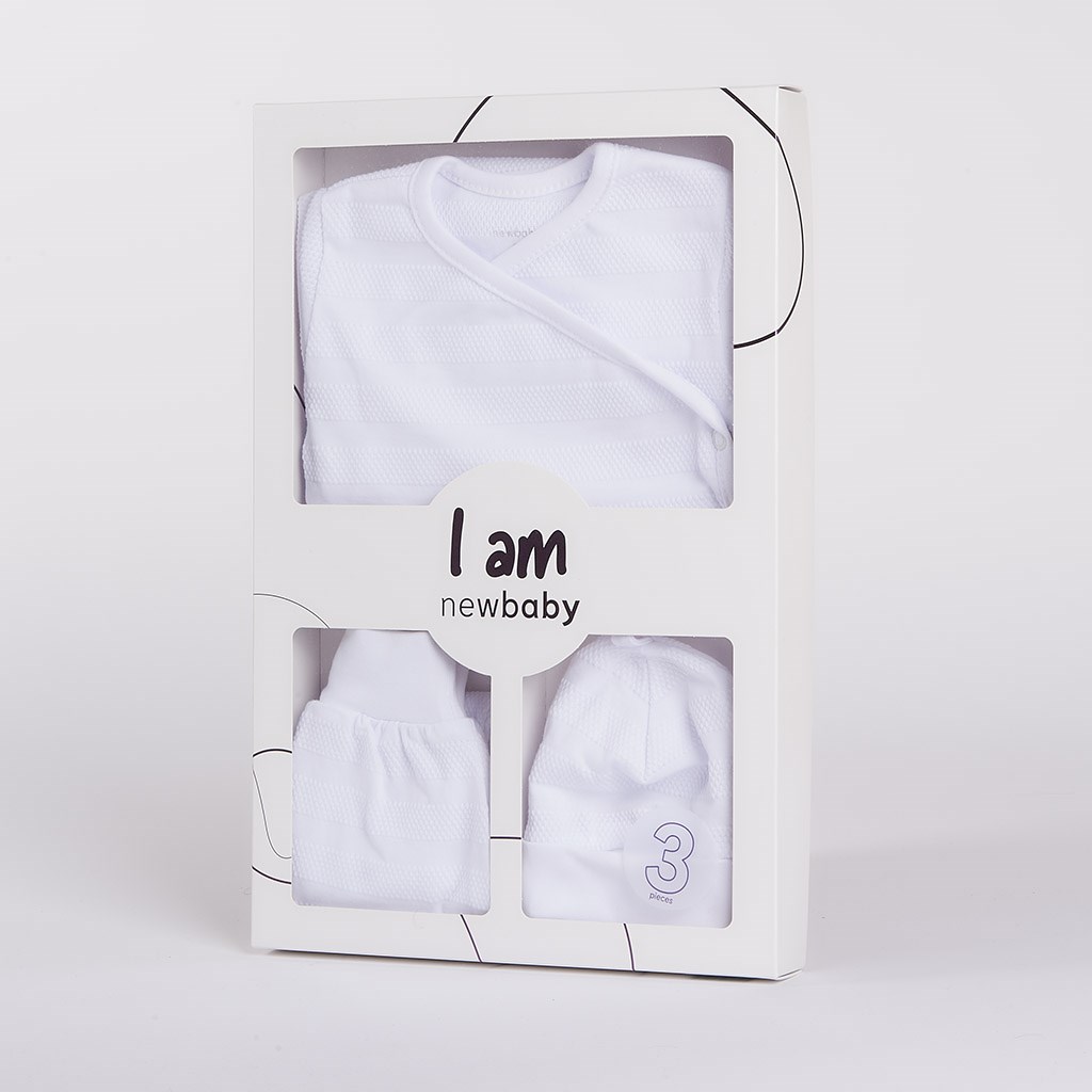Ljubka dojenčkasta 3-delna kompletička češke blagovne znamke New Baby I AM za dojenčke. Kompletiček je narejen iz zelo prijetnega, mehkega in kvalitetnega materiala, ki je primeren za dojenčke in je primeren ne le za porodnišnico. Vsebuje body z dolgimi rokavi, poldupčke in kapico. Body ima stransko zapiranje po celotni dolžini in pritiskače med nogicami. Poldupčke imajo v pasu širši elastičen rob, ki ne pritiska na trebušček dojenčka. Kapica s širšim robom dobro drži na glavici dojenčka in ne pada. Je zelo praktična in ne pritiska na glavico dojenčka. Cel komplet ima nov, izjemen dizajn z atraktivnim vzorcem blaga. Je zasnovan ob upoštevanju potreb dojenčka in je primeren tudi kot prijetno darilo. Kompletiček je v praktični Eko škatli. Sestava: 100% bombaž.