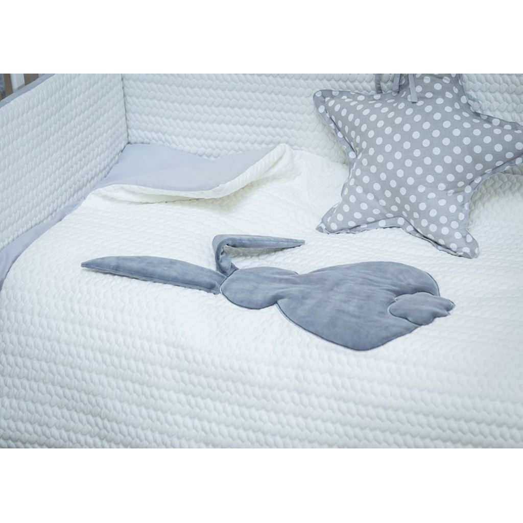 Otroški 3-delni komplet za posteljico Belisima Zajček. Komplet je z ene strani izdelan iz jersey blaga, okrašenega s 3D vzorcem in ljubkim plišastim zajčkom. Druga stran je bombažna. Izdelan je iz mehkega, prijetnega materiala. Vključuje prevleko za blazino približno 40x60 cm, prevleko za odejo približno 100x135 cm in obrobo približno 31x175 cm. Sestava: zgornja jersey stran: 50% bombaž, 50% poliester. Spodnja stran: 100% bombaž.