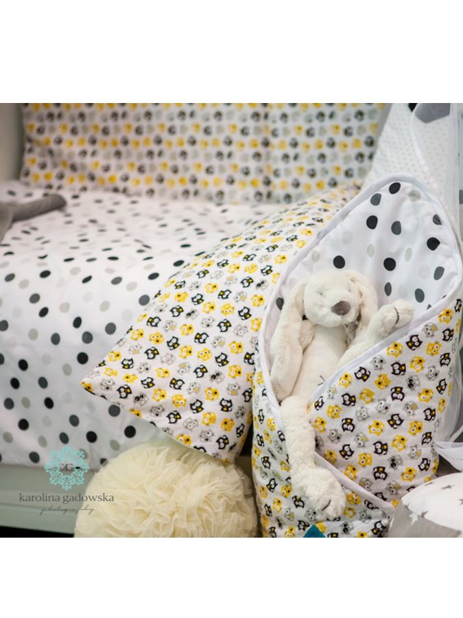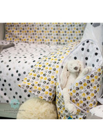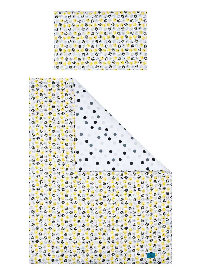 Detski bombažni 6-delni komplet za posteljico Belisima Mucki za dojenčke. Komplet je z ene strani celotno potiskan s pikicami, druga stran pa je celotno potiskana z motivi muckov. Izdelan je iz mehkega in prijetnega materiala. Komplet vključuje prevleko za blazino cca 40x60 cm, prevleko za odejo cca 100x135 cm, zaščitno obrobo cca 180 cm ter polnilo: blazino, odejo in zaveso. Zavesa: 150x200 cm. Material 100% bombaž.