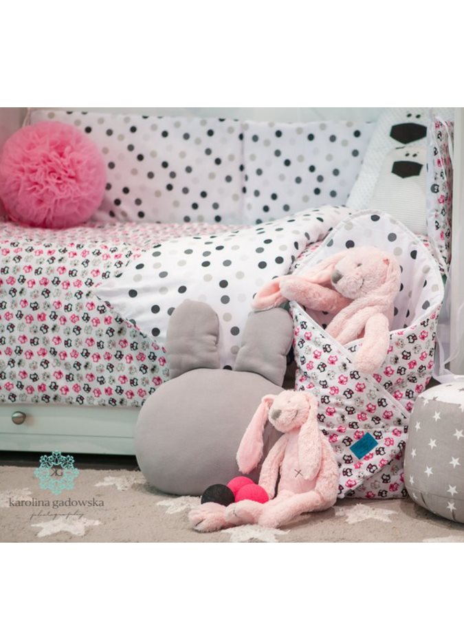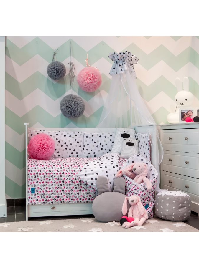 Detski bombažni 6-delni komplet za posteljico Belisima Mucki za dojenčke. Komplet je z ene strani celotno potiskan s pikicami, druga stran pa je celotno potiskana z motivi muckov. Izdelan je iz mehkega in prijetnega materiala. Komplet vključuje prevleko za blazino cca 40x60 cm, prevleko za odejo cca 100x135 cm, zaščitno obrobo cca 180 cm ter polnilo: blazino, odejo in zaveso. Zavesa: 150x200 cm. Material 100% bombaž.