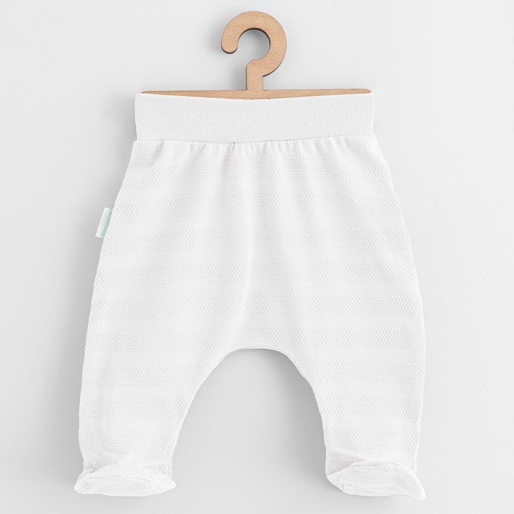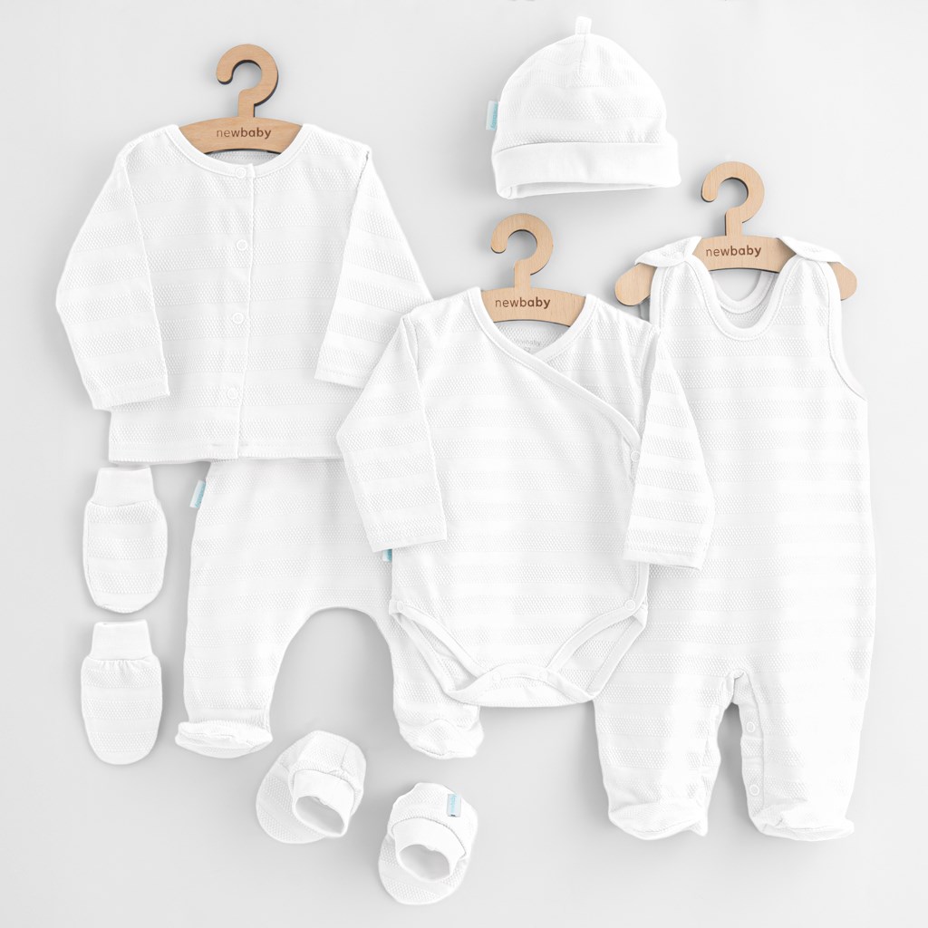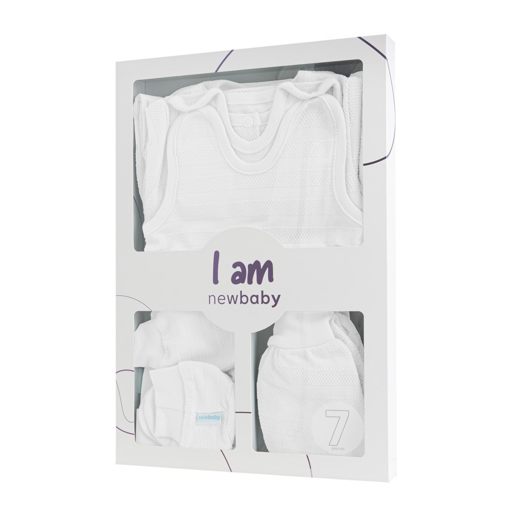 Ljubka 7-delna komplet za dojenčke češke blagovne znamke New Baby I AM. Komplet je izdelan iz zelo prijetnega, mehkega in kakovostnega materiala, ki je primeren za dojenčke in ni primeren le za porodnišnico. Vsebuje celovito zapiranje bodija z dolgimi rokavi, pajkice, polpajkice, jopico, kapico, rokavičke in copatke. Bodij ima stransko zapiranje po celotni dolžini in gumbke med nogami. Pajkice imajo zapiranje na gumbke na naramnicah in med nogami, kar olajša oblačenje in previjanje. Jopica se zapira z gumbki po celotni dolžini. Kapica z širšim robom dobro drži na glavi dojenčka in ne pada dol. Je zelo praktična in ne pritiska na glavo dojenčka. Rokavičke in copatki imajo širšo zategovalno manšeto. Celoten komplet ima nov izjemen dizajn z atraktivnim vzorcem tkanine. Je zasnovan ob upoštevanju potreb dojenčka in je primeren tudi kot ljubko darilo. Komplet je pakiran v praktični ekološki škatli. Sestava: 100% bombaž.