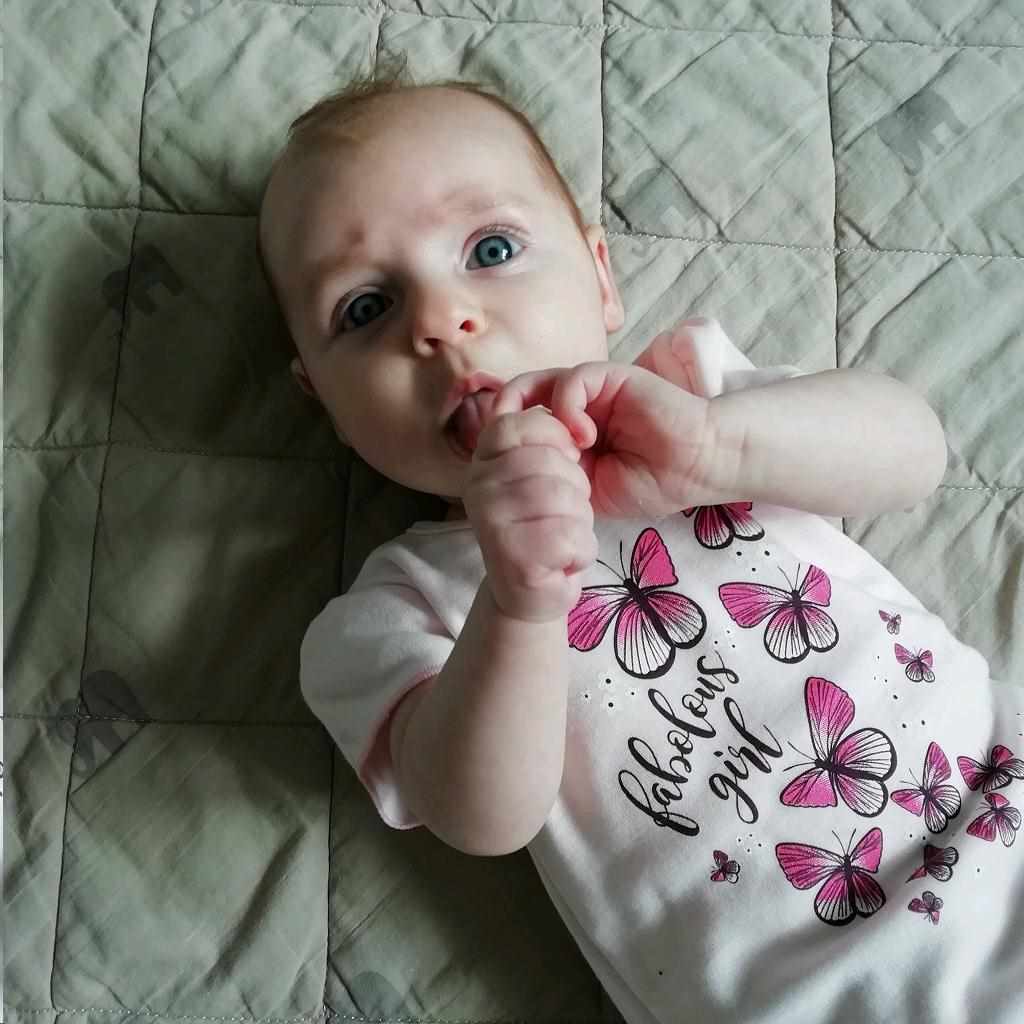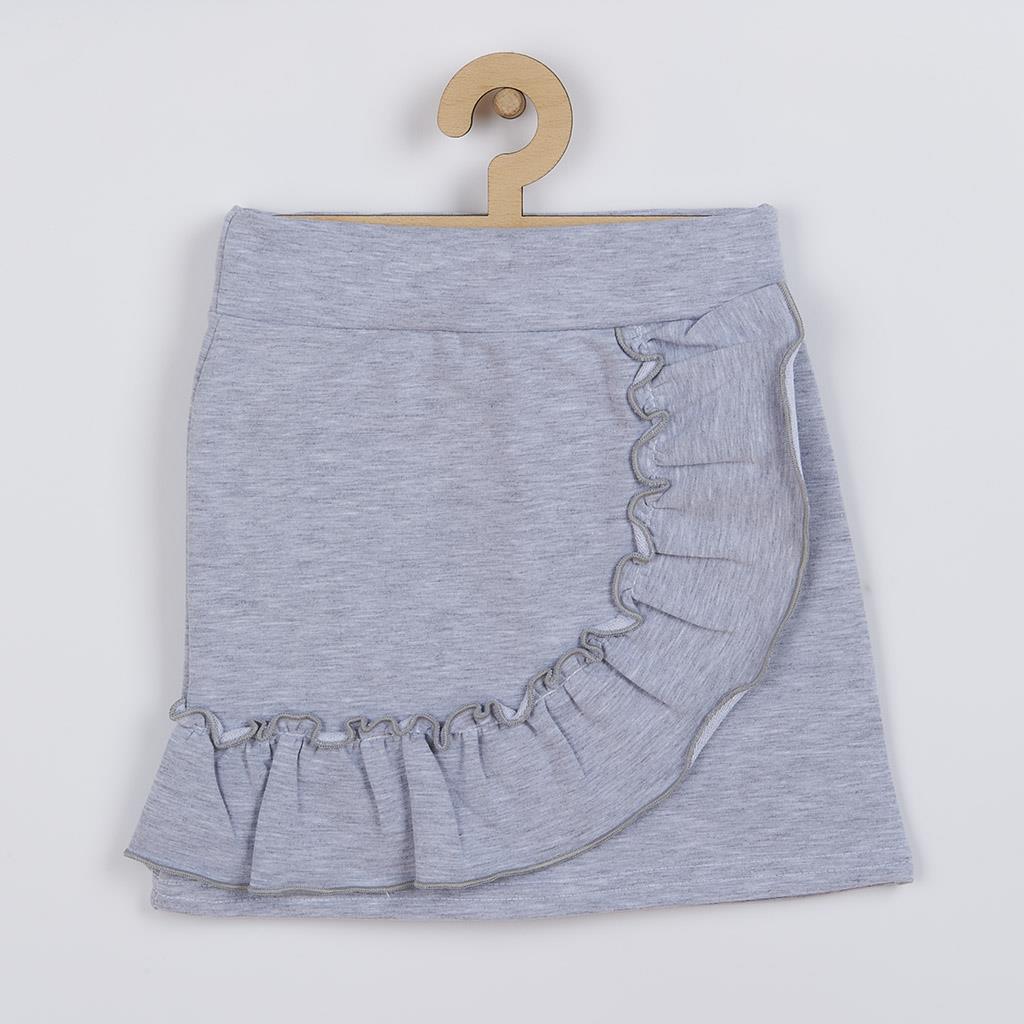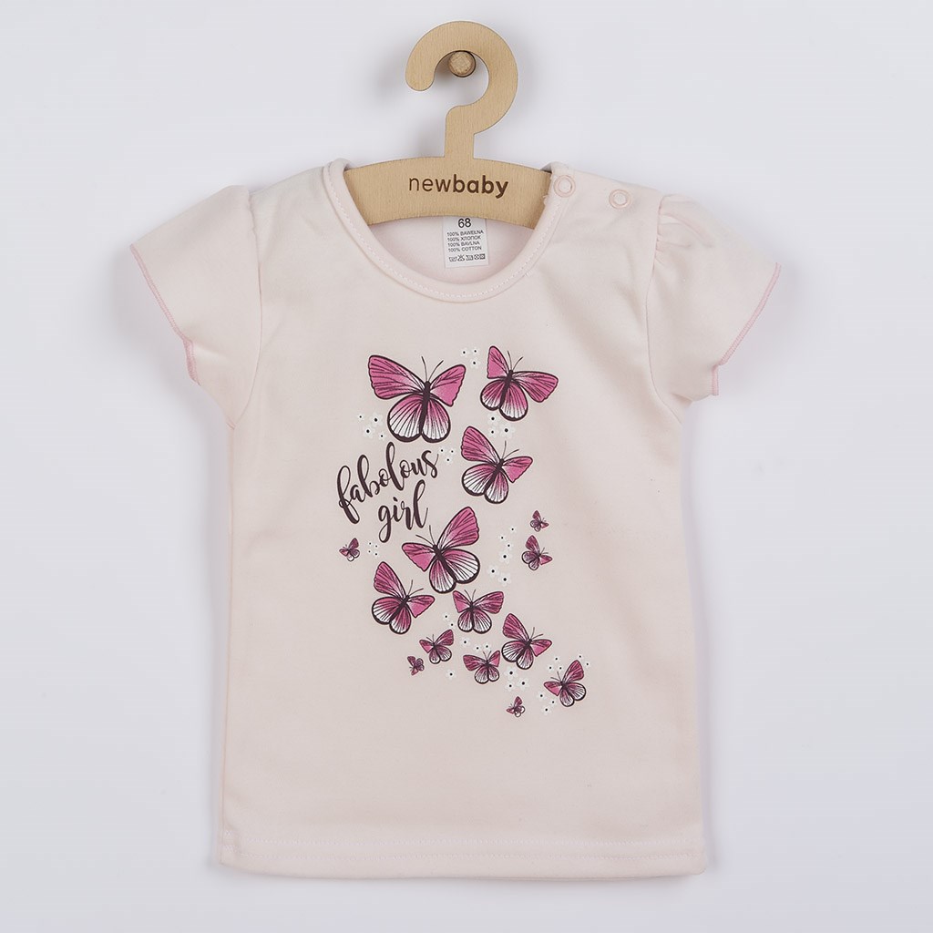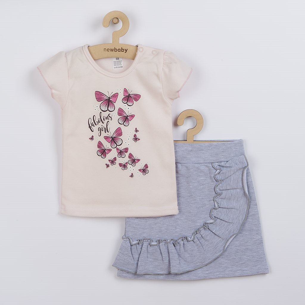 Ljubka in stylish 2-delna komplet za deklice češke blagovne znamke New Baby Butterflies. Komplet sestavljata majica in krilo. Majica s kratkimi nabranimi rokavi je okrašena z motivom metuljev. Zapiranje na ramenskem delu s sponkami olajša oblačenje prek glavice dojenčka. Sivo melirano krilo krasijo čudoviti volančki, ki krilu dodajo pravi šarm. V pasu je širša elastika, ki ne pritiska na trebušček dojenčka. Komplet je natančno in kakovostno izdelan ter je narejen iz zelo prijetnega materiala, v katerem se bo vaša deklica počutila zelo udobno. Sodobna zasnova, metulji, volančki in lepe barve. To vse najdete v naši kolekciji Butterflies, ki je nepogrešljiv del dekliškega oblačenja. Sestava: majica: 100% bombaž, krilo: 95% bombaž, 5% elastan.