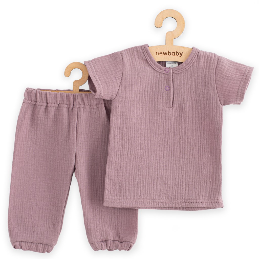 Stilska in praktična 2-delna otroška komplet češke blagovne znamke New Baby. Mušelinska kompletu se sestavlja iz majice s kratkimi rokavi in hlač. Zelo praktičen set za otroke v pomladnih in poletnih dneh. Mušelinska majica je zelo udobna, saj je izdelana iz kakovostnega in zračnega mušelinskega bombaža z nastavljanjem na gumbih pod ovratnikom. Mušelinske hlače z modernim krojem so zelo praktične, v pasu in na hlačnicah je elastika, ki ne pritiska.