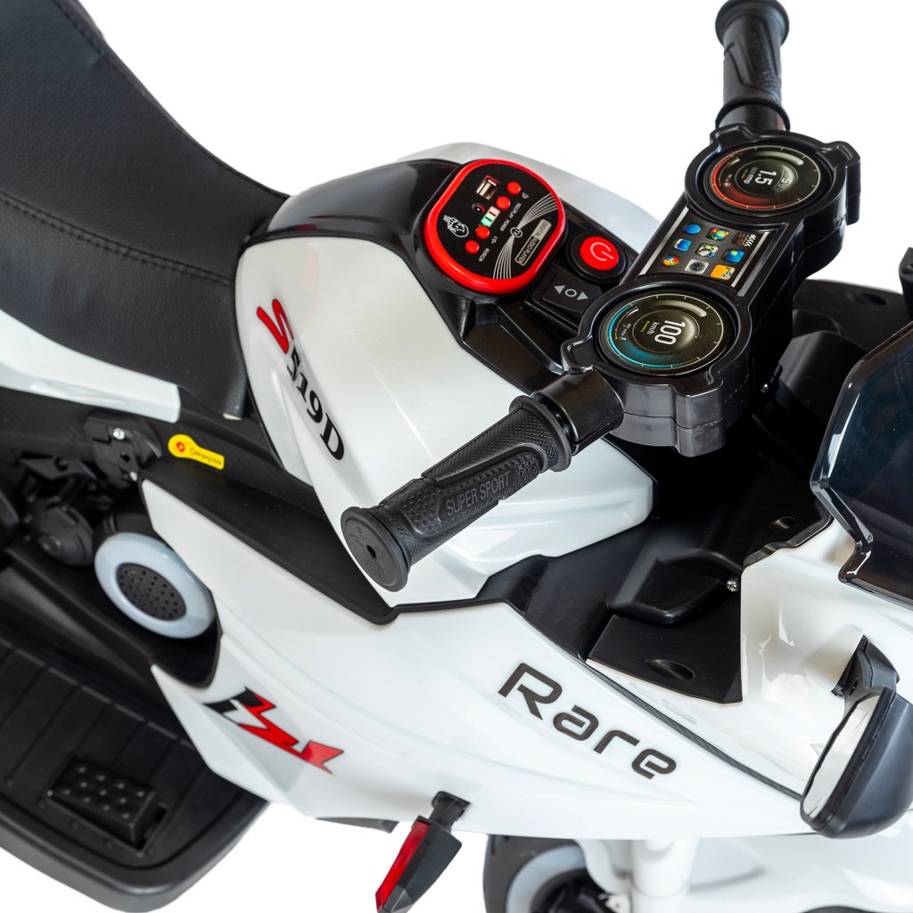 Otroška električna motorna kolesa Rare Baby Mix je opremljena z baterijo 6V7AH in dvema motorjema z močjo 380. Ima funkcijo enostavnega zagona na en gumb, kar omogoča vožnjo naprej in nazaj. Motorna kolesa sta opremljena s muziko, otroškimi pesmimi, kartico za branje podatkov za zgodnje izobraževanje, tremi kolesi in LED žarometi. Komfort zagotavlja usnjeno sedežno okno.