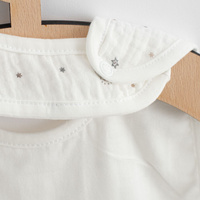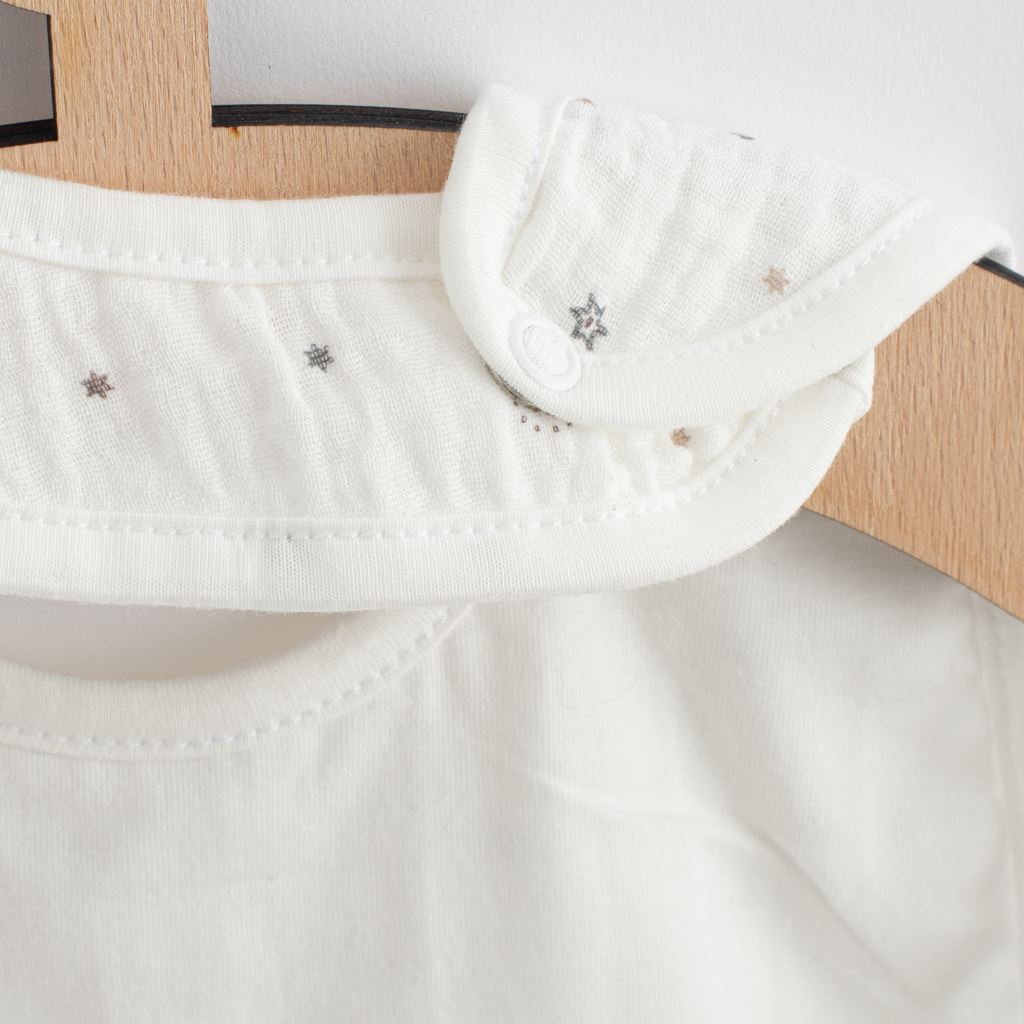 Čudovit muslinasti otroški bib slovenskega znamke New Baby Arthur. Bib se lahko zapne v 2 velikosti s pomočjo gumbov. Muslin je ena izmed najčistejših, najpreprostejših in najmehkejših tkanin na svetu. Nežno tkana zračna tkanina je tako popolna, da jo bodo otroci po vsem svetu vzljubili. Lahka struktura omogoča muslinu, da "dihajo" in zagotavlja dovolj zraka, s čimer zmanjšuje tveganje za pregrevanje. Ta lastnost pomaga ohranjati vaše otroka v udobju, varnosti in starše v miru. Muslin je zelo trpežen in brez težav prenese večkratno pranje ter s časom postane lažji in mehkejši. Dimenzije: 25x30 cm. Sestava: 100% bombaž. OEKO-TEX STANDARD 100.