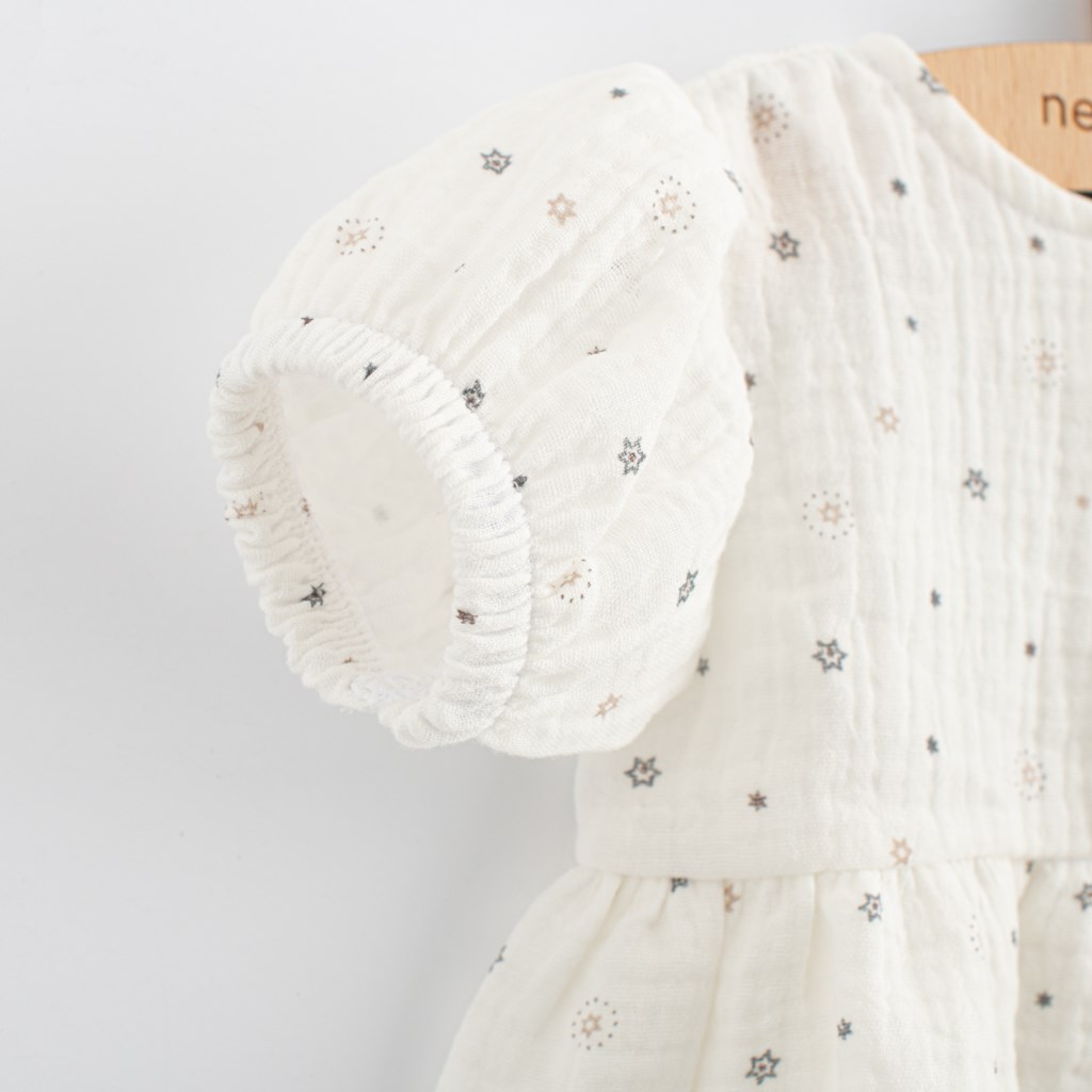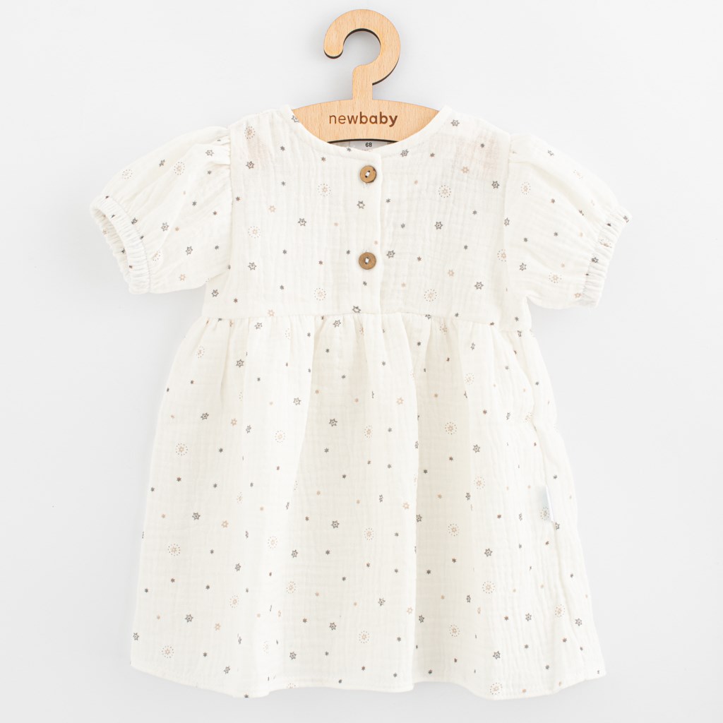 Modne muslinaste obleke za dojenčke češke blagovne znamke New Baby Zora za vse male princeske. Obleke so s kratkimi rokavi v obliki črke A. Spodnji del ima čudovito nabrano krilo. Zapenjanje na gumbke na sprednji strani olajša oblačenje. Obleke imajo zelo prijeten, mehak in kakovosten material, ki je primeren za dojenčke. So lahke in zelo prijetne za nošenje. Za New Baby je zelo pomembno zadovoljstvo strank in zato vam ponujamo naše kakovostne poletne muslinaste obleke. Sestava: 100% bombaž.