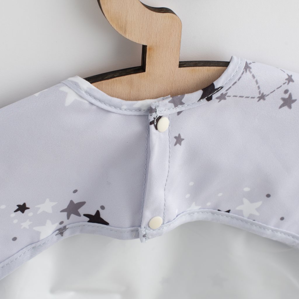 Otroška brisača-vizir z dolgimi rokavi New Baby učinkovito ščiti oblačila vašega otroka pred umazanijo med jedjo in igro. Narejena je iz lahkega in mehkega materiala. Brisača ima udoben sistem zapiranja z 2 gumbi in praktično žep. Brisača je sestavljena iz dveh plasti materialov. Spodnja plast je iz nepremočljivega materiala. V primeru umazanije je mogoče brisačo obrisati z vlažno krpo ali oprati v pralnem stroju.