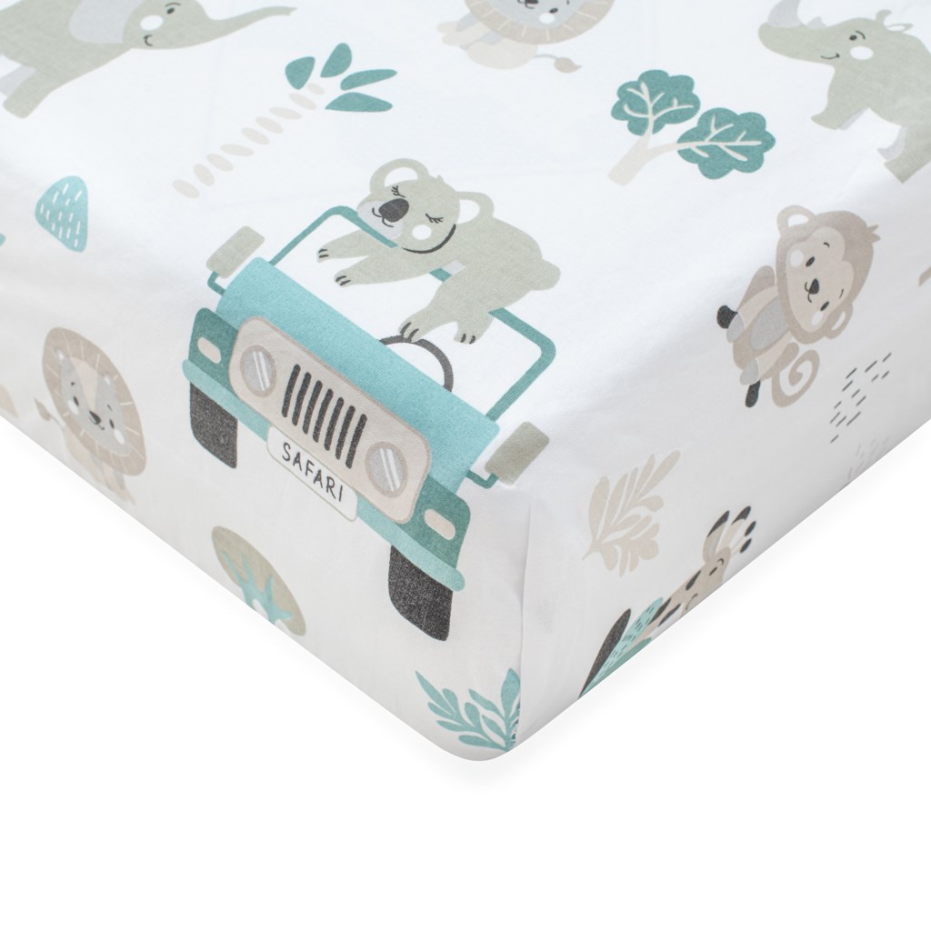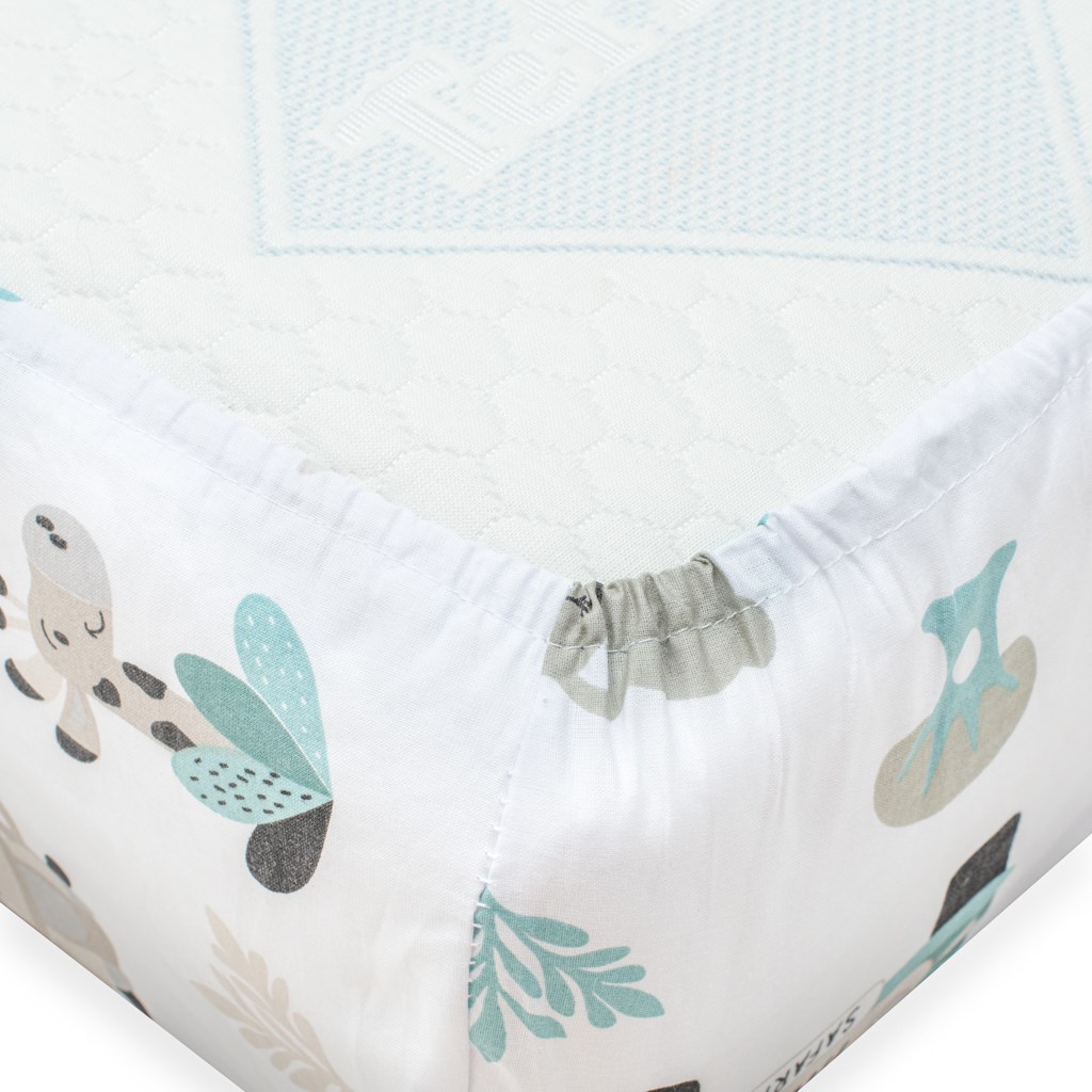 Bombažna rjuha New Baby Safari je izdelana iz gladke in prijetne bombažne tkanine. Lep otroški motiv bo razveselil otroške oči. Všit gumijasti trak preprečuje drsenje s matrice, zagotavlja pravilno napetost rjuhe in omogoča prilagoditev kakršni koli obliki. Rjuha je primerna za matrice dimenzij 120x60 cm. Rjuha je klasična bombažna, ki ni elastična, in zato ima dimenzije 90x150 cm, da lepo prilega celotni matrici tudi z dno.
