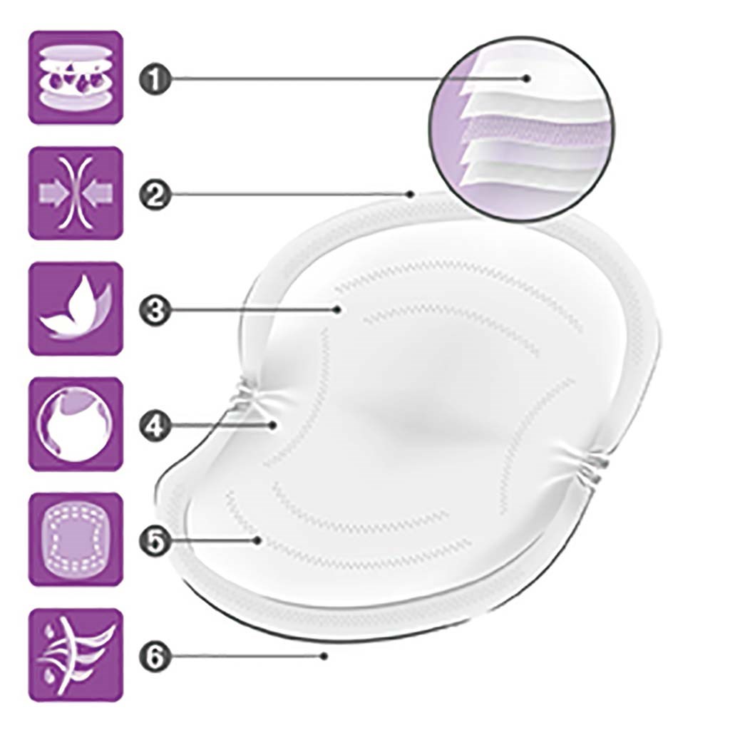 Laktacijske ultra vpijajoče prsne blazinice NUK za vse doječe mamice. Namenjene so ženskam z močno laktacijo. Nudijo udobje čez dan in ponoči. Imajo visoko absorbcijsko sposobnost zahvaljujoč dvema absorpcijskima plastema. Zaradi dvojnega samolepilnega traku ostanejo na svojem mestu. Svilen, mehak in zračen naravni material zagotavlja popolno udobje za vsako mamico. Pakiranje 30 kosov.