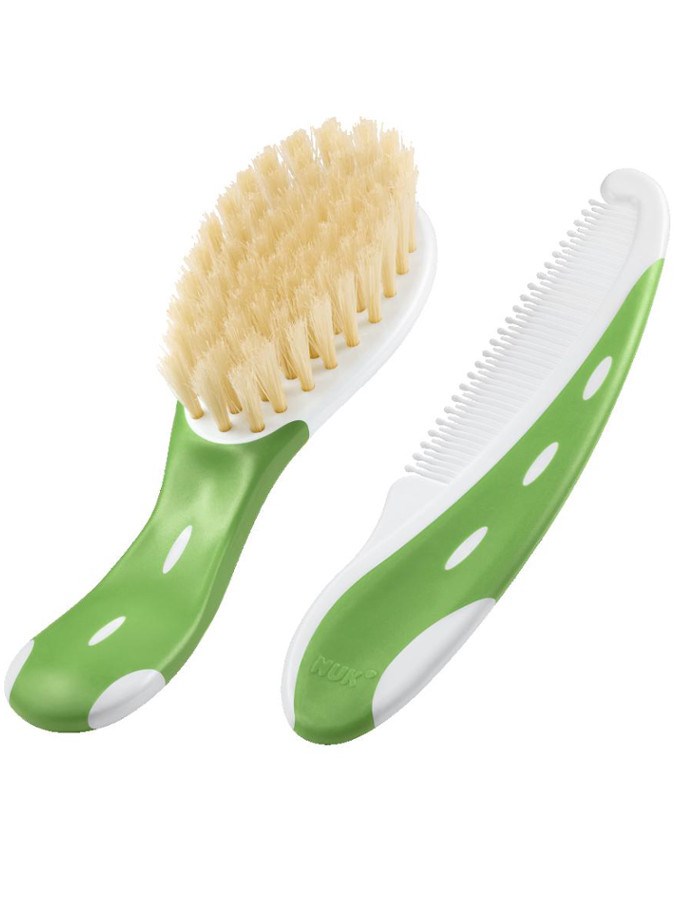 Četka in glavniček Nuk. Četka za lase iz nežnih naravnih vlaken s glavničkom. Četka nežno masira lasišče dojenčka, kar podpira prekrvitev kože in krepi lase ter jih oblikuje. Glavniček ima zaobljene robove, kar olajša nego otroka. Protislizka ročica zagotavlja udobno držanje glavnička in četke. Primerno za otroke od rojstva naprej.