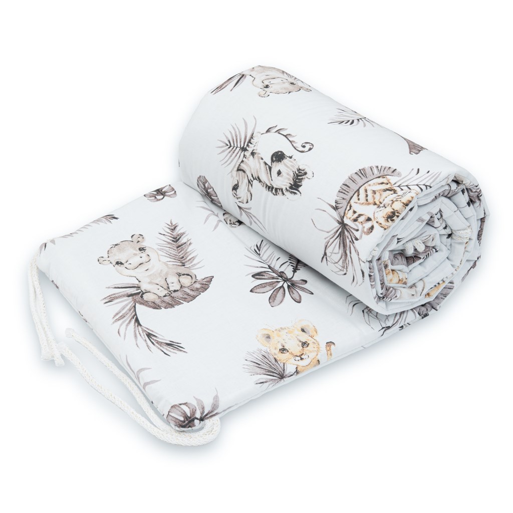 Moderen in praktičen zaščitni naslon za posteljico New Baby. Narejen je iz mehkega in prijetnega materiala. Sestava: 100% bombaž. Polnilo: 100% poliester. Pripenjanje na posteljico s pomočjo trakov. Dimenzije: približno 180x30 cm.