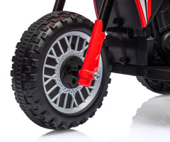 Po vklopu se zasliši zvok motorja in po pritisku na plin se motorna kolesa zažene. Velika kolesa z terenim vzorcem zagotavljajo stabilnost pri vožnji na prostem, oblikovano sedežno mesto pa zagotavlja udobje in varnost za najmlajše uporabnike. Jeklene osovine koles zagotavljajo stabilnost in trdnost vozila. Priložen je tudi opozorilni zvonec, ki bo igro naredil še bolj zabavno.