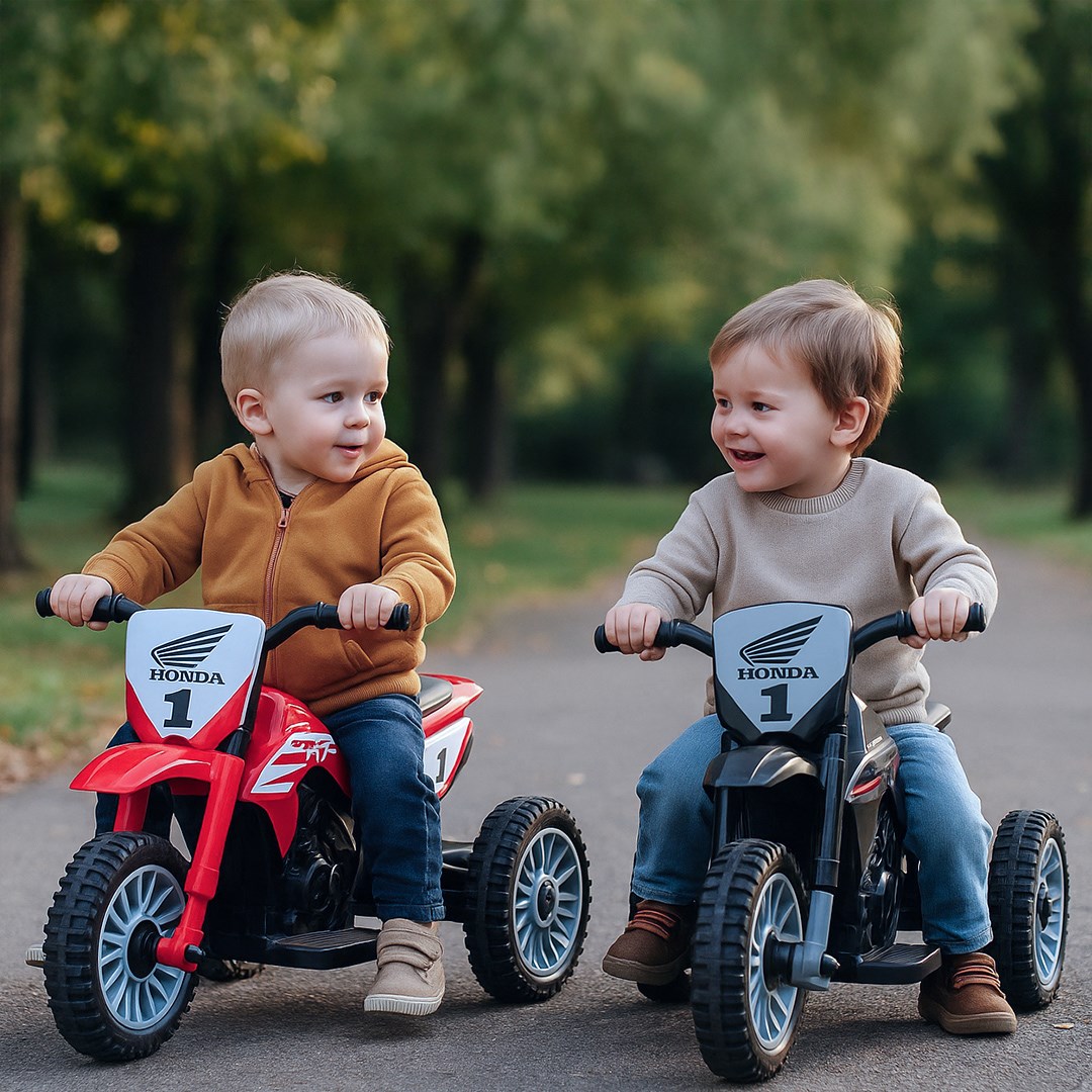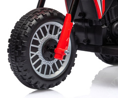 Po vklopu se zasliši zvok motorja, in po pritisku na plin se motorno kolo premakne. Velika kolesa z terenskim profilom zagotavljajo stabilnost med vožnjo na prostem, oblikovano sedežno mesto pa zagotavlja udobje in varnost najmlajših uporabnikov. Jekleni osi koles zagotavljajo stabilnost in vzdržljivost vozila. Vključeno je tudi kukalo, ki bo igranje še bolj zabavno.