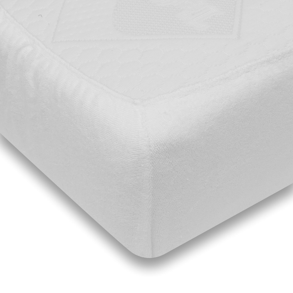 Frotirna bombažna prevleka za posteljo. Elastični trak okoli robov olajša prilagajanje vzmetnici. Dimenzije 120x60 cm. 90% bombaž, 10% poliester.