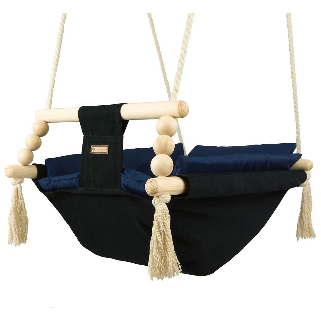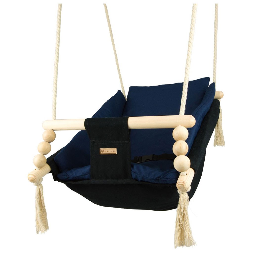Zaradi uporabe prijetnega bombaža se tu otrok počuti prijetno, udobno in varno. Močna bombažna vrvica je opremljena s kovinskimi kolesi, ki omogočajo namestitev gugalnice tudi na teraso, verandu ali v vrt.