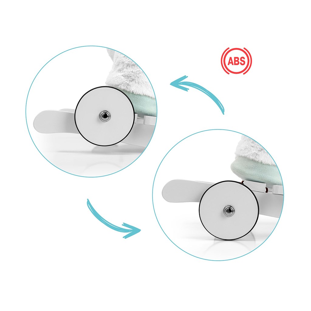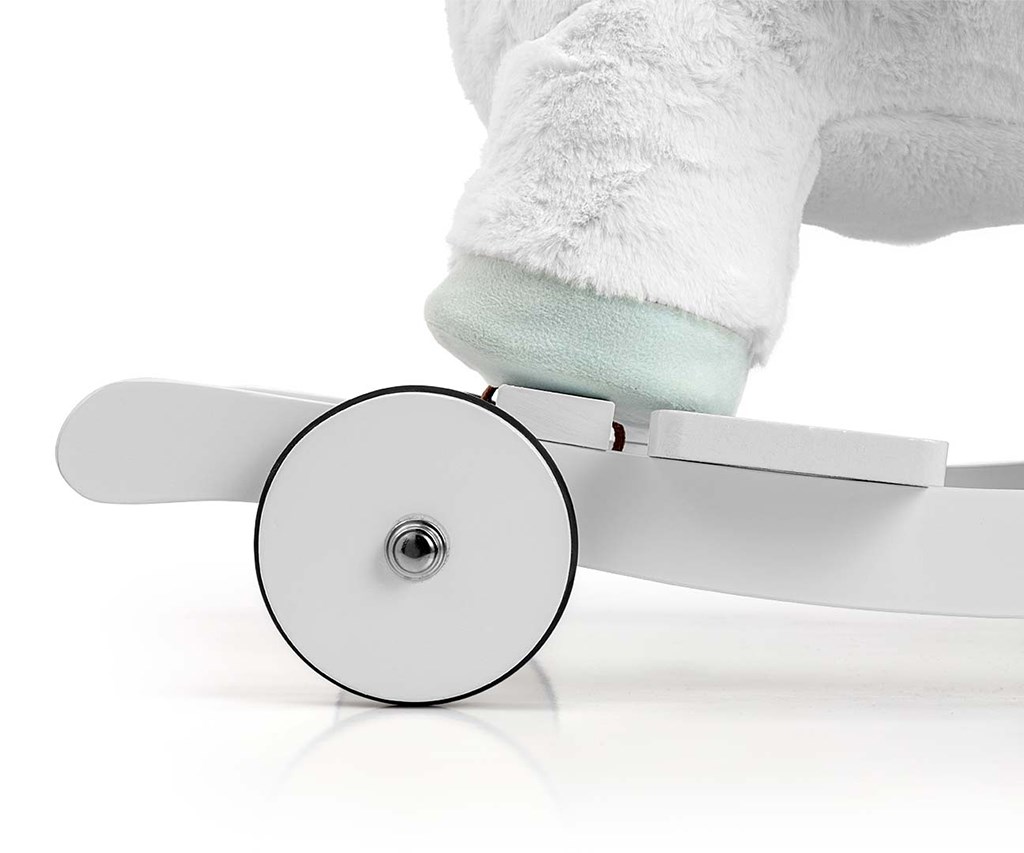 Konjiček ima lesene podlage z oporami za noge in ročaji, ki pomagajo pri ohranjanju ravnotežja med igro, ter komplet zložljivih koles, ki ga v nekaj sekundah spremenijo v čudovito plišasto vozilo.
