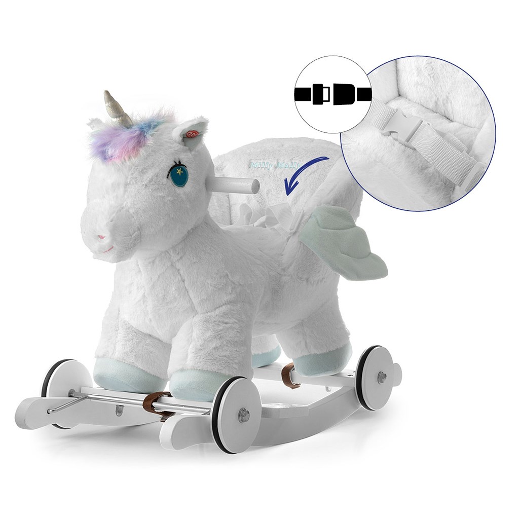 Mehki gugalni konjiček Polly je zasnovan za najmlajše otroke (12m+), ki so jim tradicionalni gugalni konjički preveliki. Udobno, ergonomično sedišče v obliki naslonjala za stol in nastavljive varnostne pasove zagotavljajo udobje in varnost pri brezskrbnem guganju ter premikanju otroka.