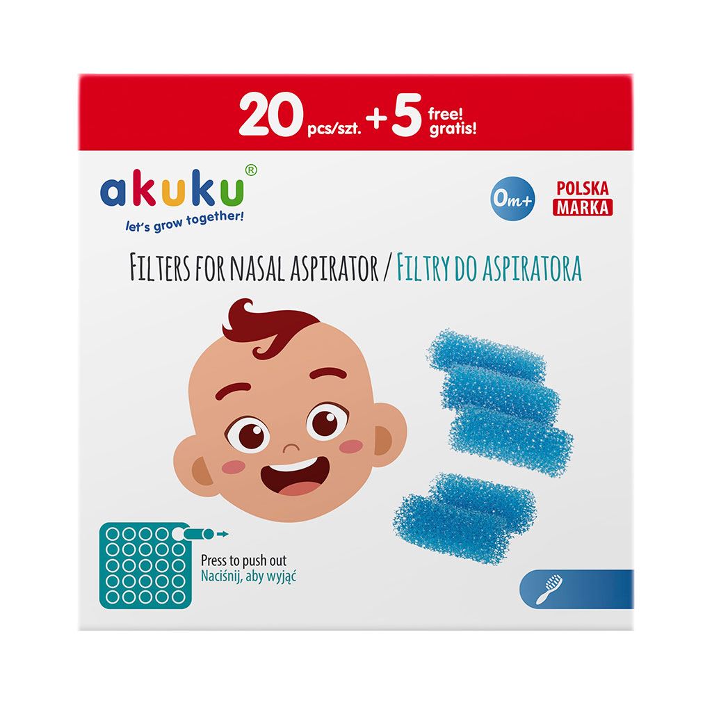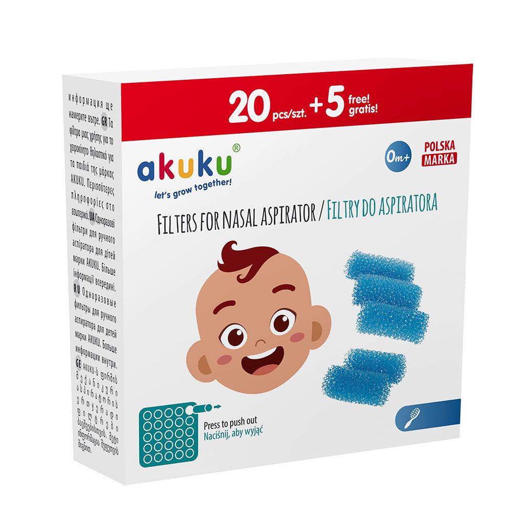 Zamenljivi filtri za nosni sesalnik AKUKU, ki preprečujejo vstop izcedka iz nosu v cevko z ustnikom in tako preprečujejo okužbo osebe, ki čisti nos otroka. So nujni za pravilno in higienično delovanje sesalnika. Zajamejo nosni izcedek v napravi in zaščitijo oskrbovalca otroka pred okužbami.